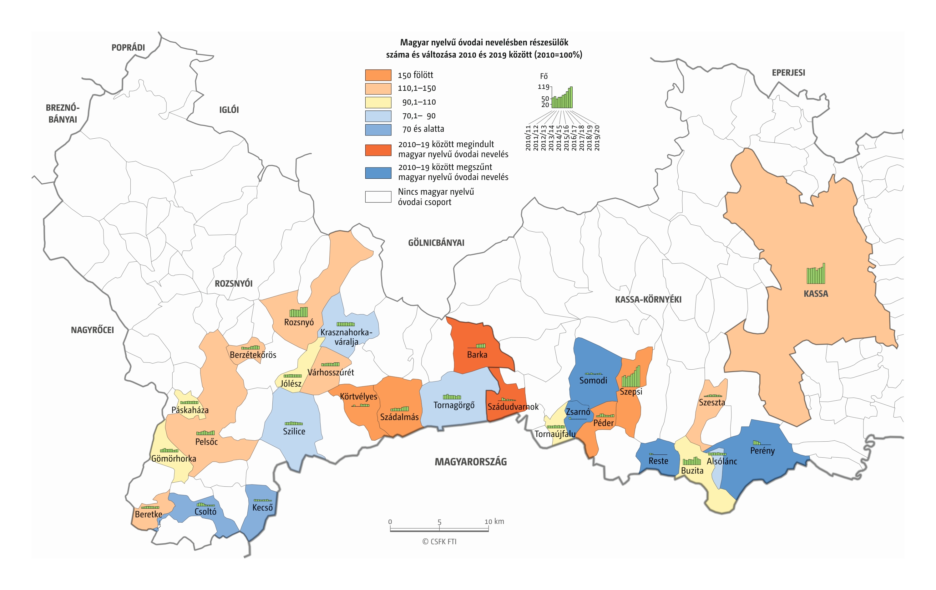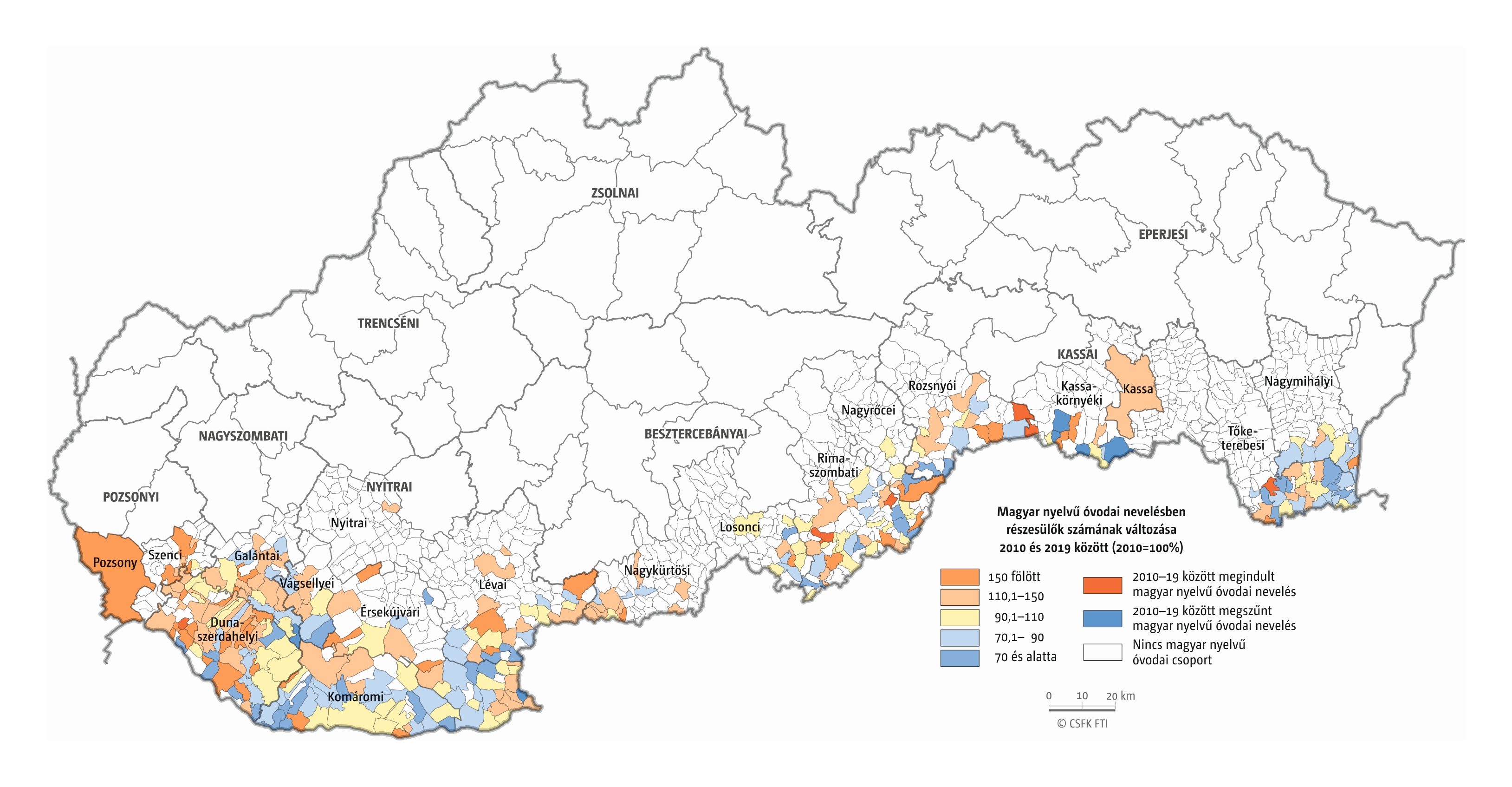 A szlovákiai magyar óvodahálózat a vizsgált tízéves időszakban a stabilitás jeleit mutatja. A 2010/11-es tanévben 348 óvoda működött, ebből 270 volt magyar, 78 pedig szlovák–magyar közös igazgatású intézmény. A 2019/20-as tanévben ugyancsak 348 óvoda alkotta a magyar óvodahálózatot, a közös igazgatású intézmények száma 74, az önálló magyar óvodáké pedig 274 volt.