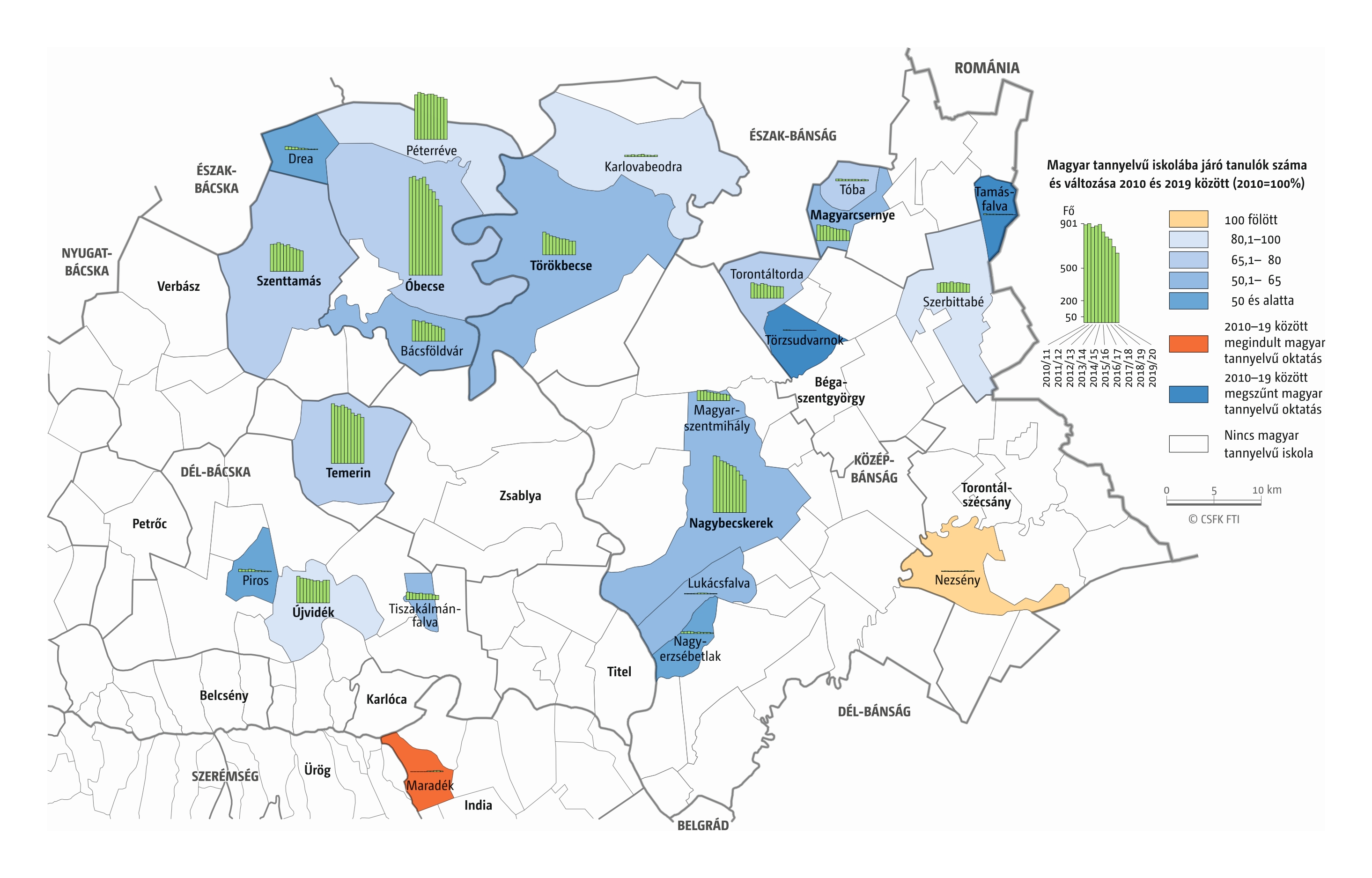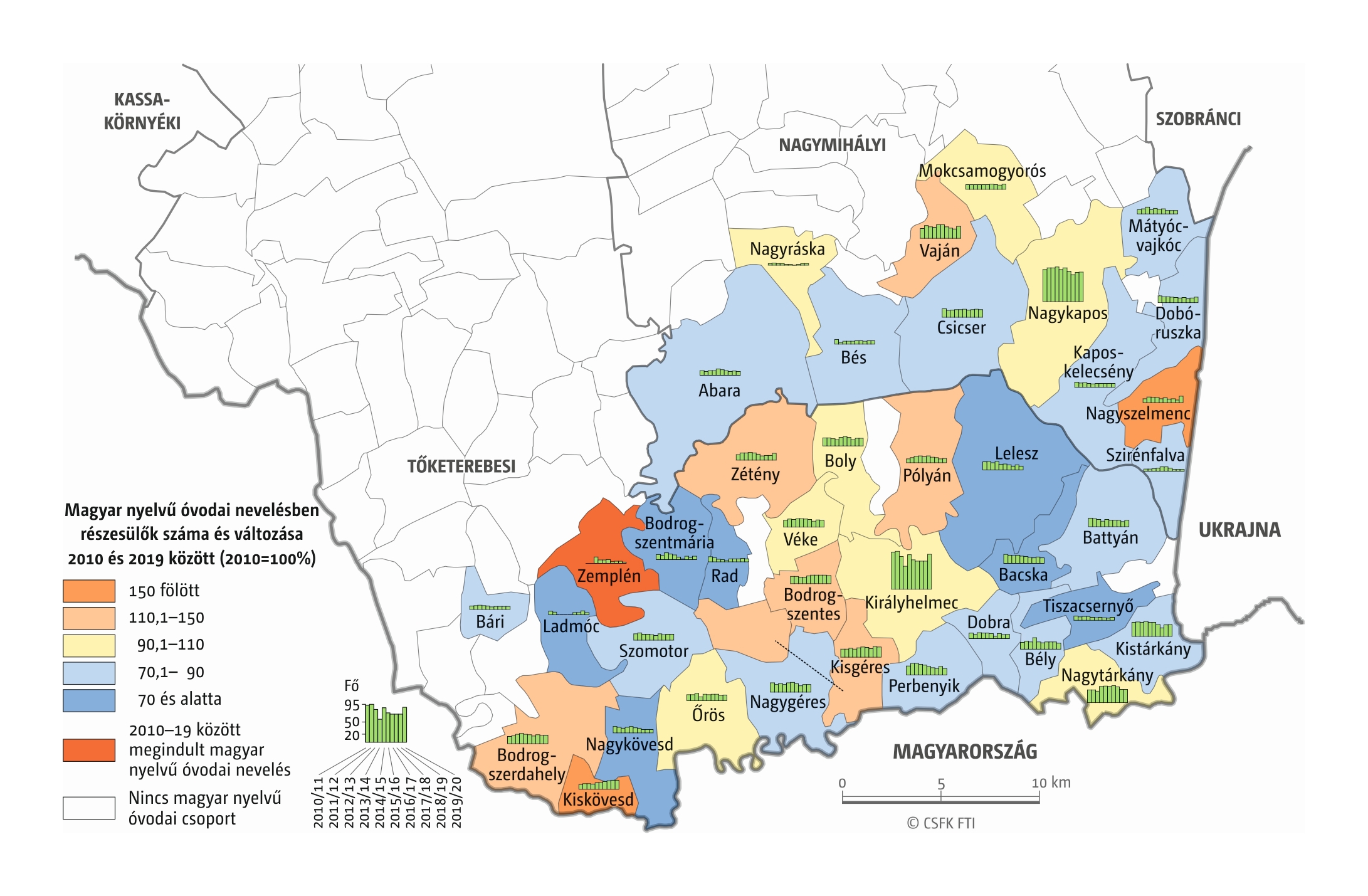 A Vajdaság esetében részletes óvodai adatok csak a 2016–2019 közötti négy tanévre álltak rendelkezésünkre települési szinten. Az iskola-előkészítő csoportokba járók száma pedig csak községi szinten volt elérhető a 2010–19-es időszakra. (A vizsgált országok közül az ukrajnai, romániai és szerbiai területi adminisztrációban az alapfokú közigazgatási egységek az egy vagy több településből álló községek. Ezek mérete változatos, Romániában és – a 2020-as közigazgatási reform óta – Ukrajnában általában pár település, míg Szerbiában a magyarországi járásnak megfelelő méretű.)