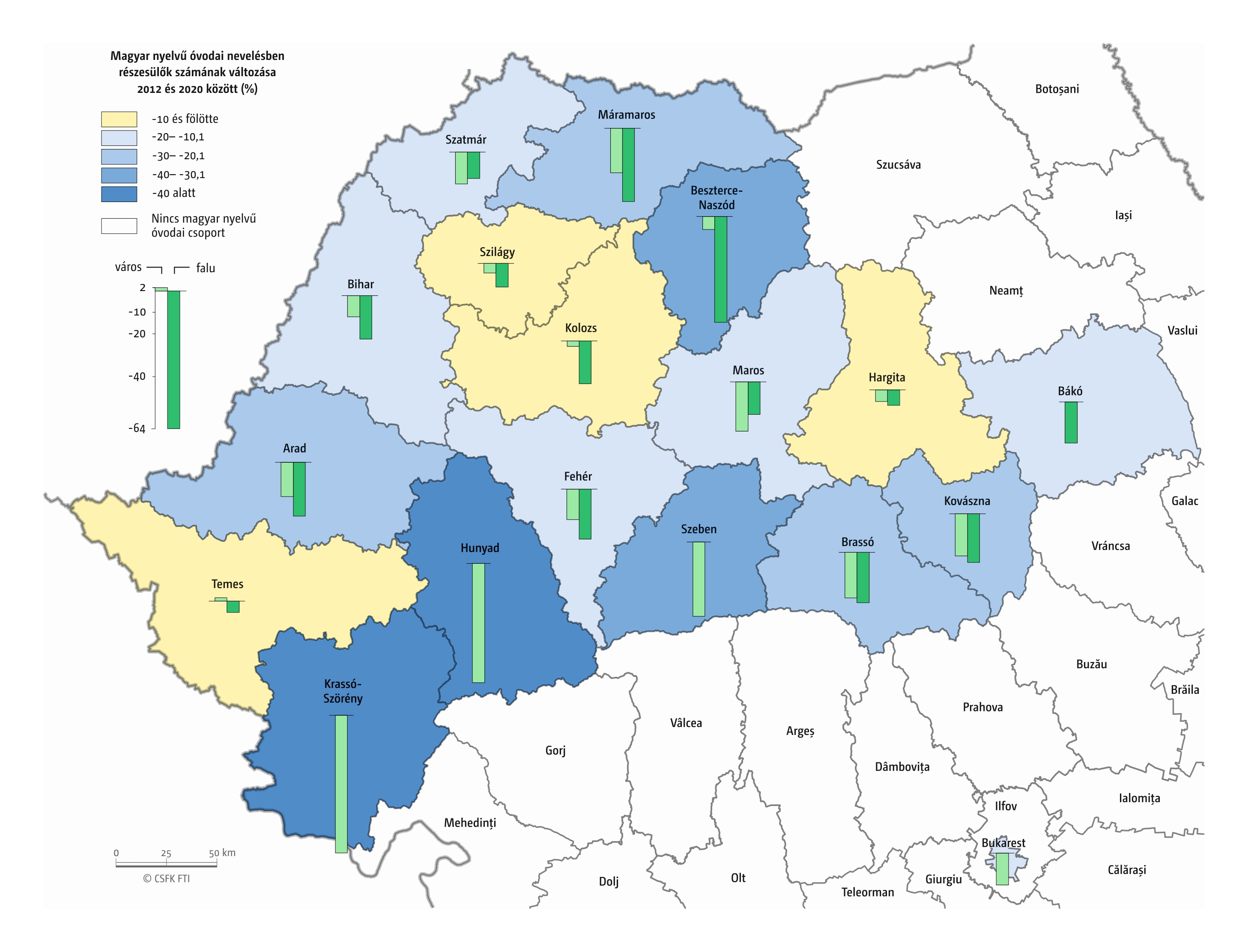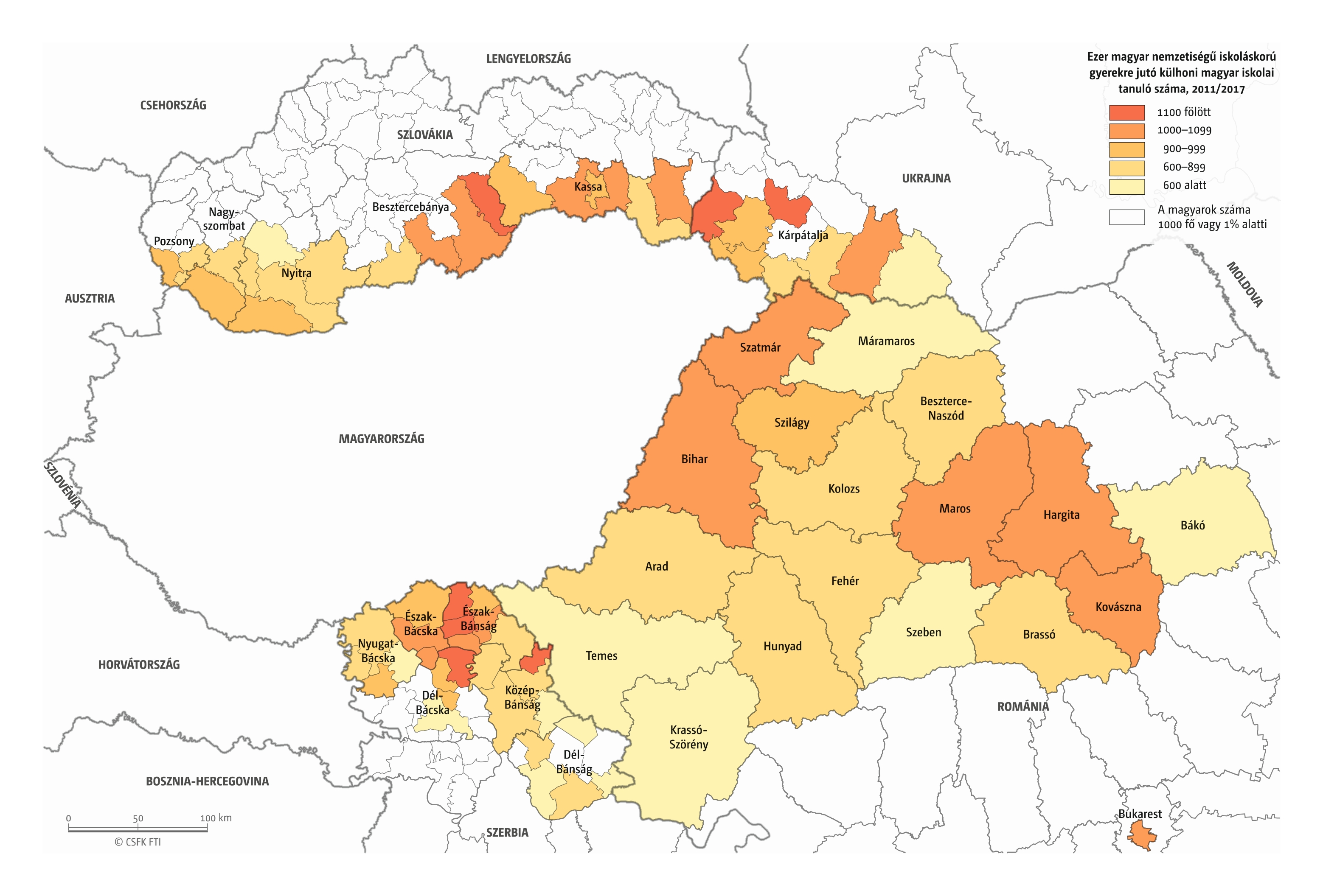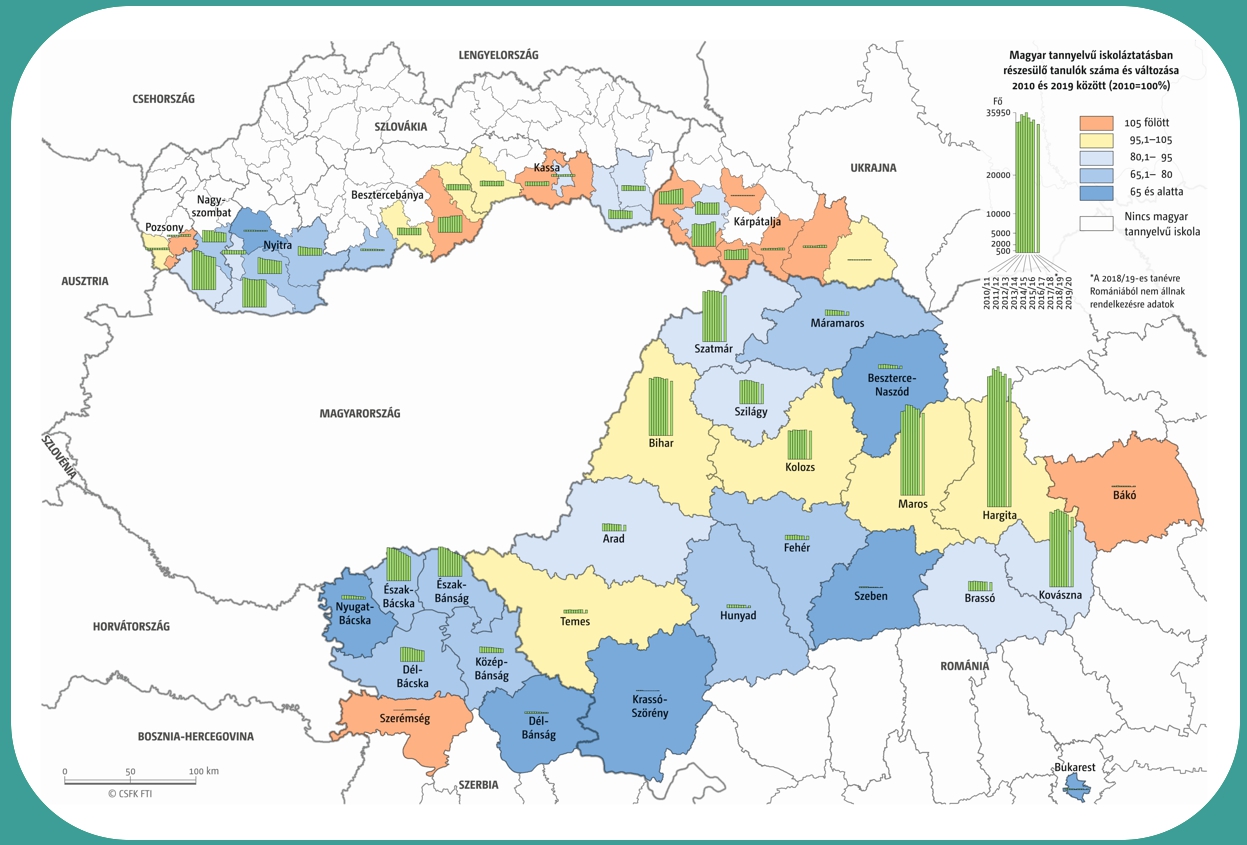 Hasonlóan jártunk el, amikor összevetettük a magyar iskolák elsőseinek számát és a hat évvel korábban született magyar nemzetiségűnek regisztráltak számát. Mivel itt sem esnek egybe az iskolaévek szerint rendelkezésre álló oktatási statisztikák és a naptári évek szerint gyűjtött népmozgalmi adatok, továbbá sok gyerek kezdi 7 éves korban az iskolát, valamint a születések számának éves ingadozása jelentős lehet, ezért a 2016–2019 közötti tanévek átlagos adatait vetettük össze a 2010–2013 közötti születések átlagával. Ez tehát szintén csak egy közelítő érték, de a főbb trendekről, az adott országon belüli regionális eltérésekről megfelelő képet ad.