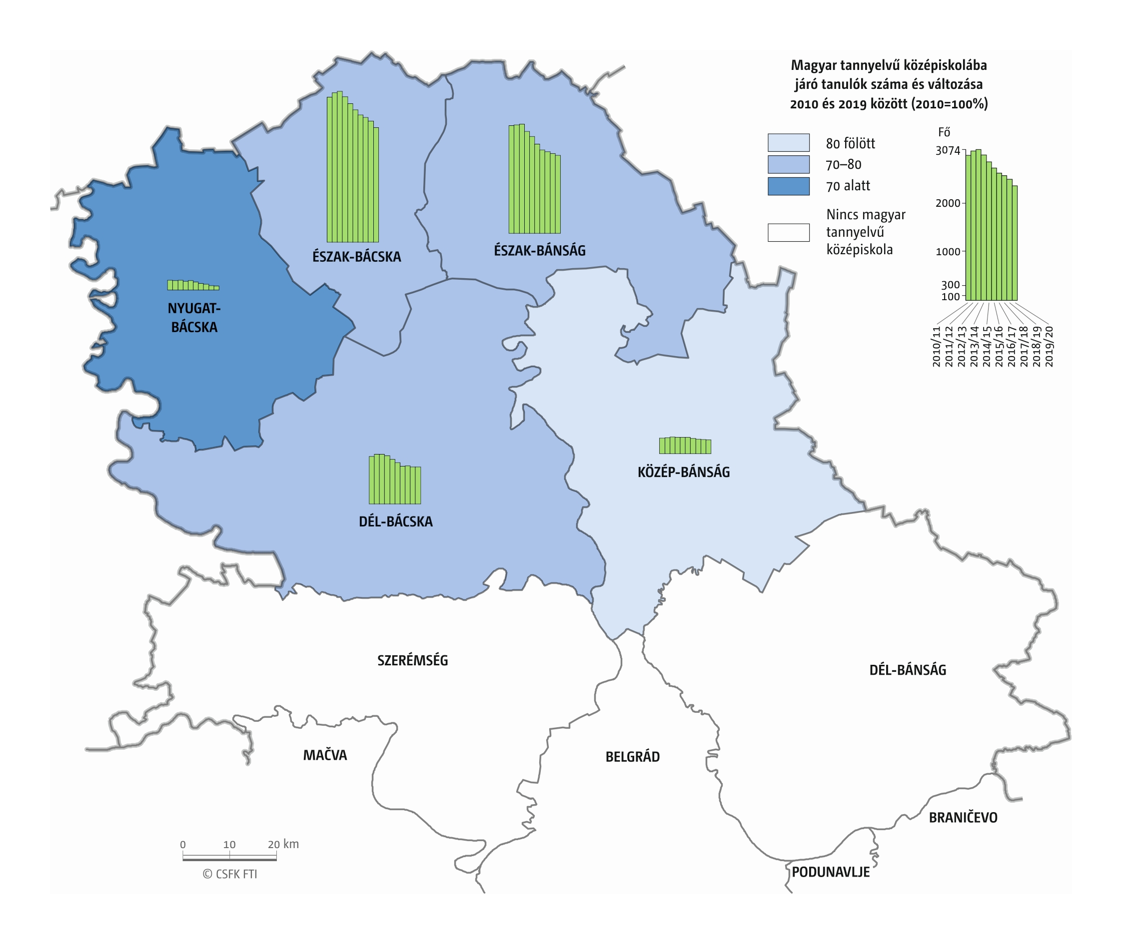 A határon túli magyar középiskolai tanulók száma 2010 és 2019 között jelentős mértékben, közel ötödével, 56 ezerről 45,3 ezerre csökkent. A csökkenés mértéke Szlovákiában és a Vajdaságban jelentősebb, Erdélyben és Kárpátalján mérsékeltebb volt. Szlovákiát leszámítva a középiskolai tanulók számának csökkenése volt jellemző lényegében az összes közigazgatási egységre (81. térkép). Dél-Szlovákiában ugyanakkor egyaránt megtalálhatók a növekedést mutató járások, és kiterjedt, drasztikus fogyással jellemezhető járáscsoportok is. A középiskolai tanulók esetében a magyarországi tanulmányok folytatása arányaiban jelentősebb, mint az általános iskolai tanulók esetében – a négy vizsgált országból származó tanulók összesített létszáma 2200–2800 fő között alakult a 2010-es években –, de mindez nem volt érdemi hatással a határon túli középiskolás tanulói kontingens csökkenésére, mivel a vizsgált időszakban a Magyarországon tanuló külhoni magyar középiskolás diákok száma is csökkent.