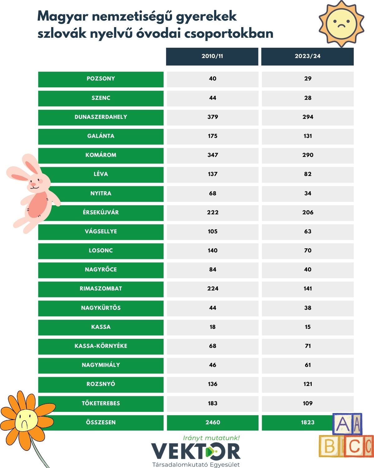 A magyar nevelési nyelvű óvodai intézményeket látogató gyerekek száma nőtt tehát, de ez nem jelenti azt, hogy a magyar nemzetiségű óvodások száma is hasonló mértékben nőtt. Sőt, az adatok alapján 2010 és 2023 között 3%-kal, 9952-ről 9672-re csökkent a számuk, ami tehát azt mutatja, hogy a kedvező beóvodázási adatok mögött nem állnak szükségszerűen kedvező demográfiai folyamatok. A magyar nemzetiségű óvodások számának változása területileg egyenlőtlenül zajlott le. A nyugati járások közül (Pozsonytól a Lévai járásig) csak Pozsonyban és a Dunaszerdahelyi járásban pozitív előjelű a magyar nemzetiségű óvodások számának a változása, ezekben a közigazgatási egységekben elsősorban az országon belüli migráció, illetve ennek egy speciális válfaja, a szuburbanizáció járult hozzá a gyerekszám növekedéséhez. Szintén a belső migráció eredménye a kassai magyar nemzetiségű óvodások számának kiugró, másfélszeres növekedése. A Nagykürtösi járástól az ukrán határig található járások közül viszont csak a Losonci és a Tőketerebesi járásban csökkent a magyar nemzetiségű óvodások száma, ellenben a Rimaszombati és a Rozsnyói járásokban a növekedés üteme a 10%-ot is meghaladta. A keleti járásokban a kedvezőbb adatok hátterében elsősorban a magyar nemzetiségű roma gyerekek számának növekedése áll.