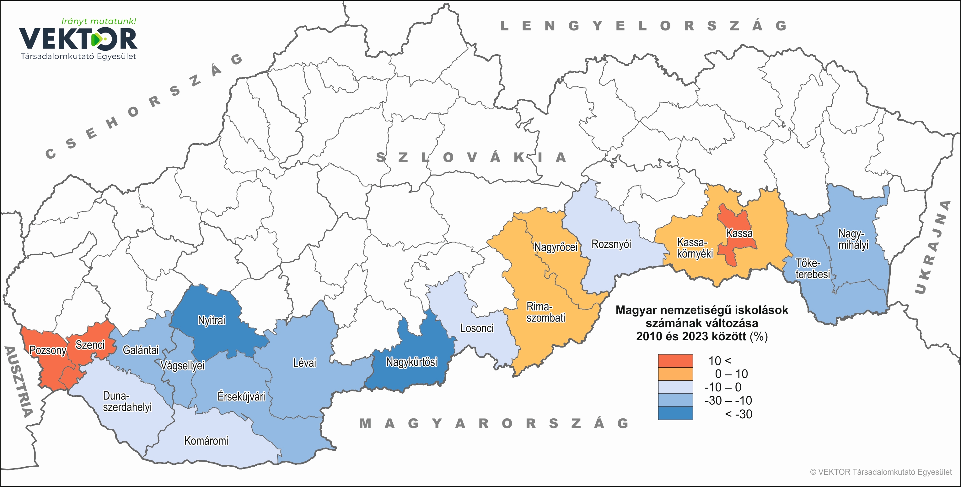 Lényeges kérdés, hogy a fent bemutatott trendek mennyire vannak összhangban a demográfiai folyamatokkal, azaz a magyar nemzetiségű iskolások számának változásával. Az országos szintű adatok azt mutatják, hogy a demográfiai helyzet jelentősen kedvezőtlenebb az iskolai mutatókénál, ugyanis a magyar nemzetiségű iskolások száma 2010 és 2023 között 11%-kal, 35 759-ről 31 832-re csökkent. Természetesen a folyamat egyenlőtlenül zajlott le: a területi kép pedig kísértetiesen hasonlít a magyar iskolába járók létszámváltozásának mintázataihoz. Az okok nagyrészt ugyanazok: a nagyvárosokba (Pozsony, Kassa) és agglomerációjukba irányuló belső migrációs folyamatok jelentősen átrendezték a magyarok országon belüli megoszlását. A migráció mellett a természetes szaporodás különbségei is közrejátszottak, melyek a keleti járásokban magasabb gyerekszámot eredményeztek. A fenti tényezők mellett az asszimilációval érdemes még számolni, amely a szórványterületen a magyarok alacsonyabb etnikai reprodukciójához vezet (azaz nem lesz minden magyar szülőnek magyar gyereke).