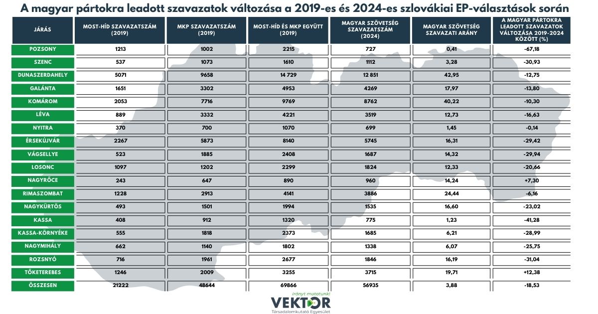 Érdemes összevetnünk az előző EP-választáson az MKP és a 2019-re már jelentősen meggyengült Most-Híd együttes eredményét a Magyar Szövetség idei eredményeivel. A déli járásokban a két párt 2019-ben közel 70 ezer szavazatot szerzett, a Magyar Szövetség 57 ezret. A közel 20%-os különbség annak tükrében még jelentősebb, hogy 2024-ben jóval nagyobb volt a részvételi hajlandóság, mint 2019-ben.