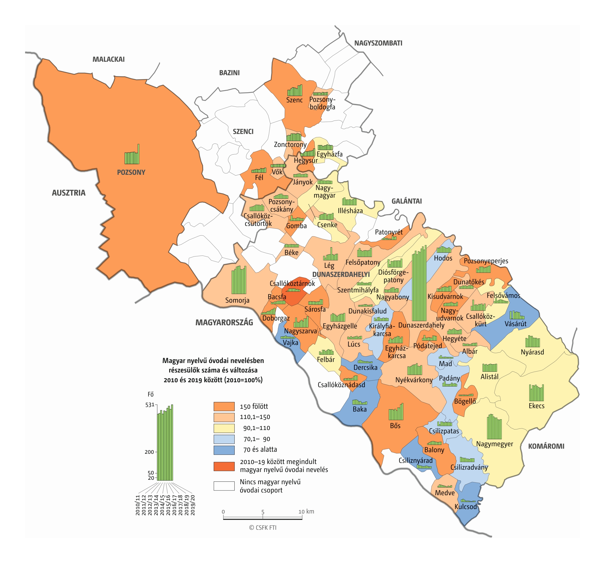 A szlovákiai magyar óvodahálózat a vizsgált tízéves időszakban a stabilitás jeleit mutatja. A 2010/11-es tanévben 348 óvoda működött, ebből 270 volt magyar, 78 pedig szlovák–magyar közös igazgatású intézmény. A 2019/20-as tanévben ugyancsak 348 óvoda alkotta a magyar óvodahálózatot, a közös igazgatású intézmények száma 74, az önálló magyar óvodáké pedig 274 volt.