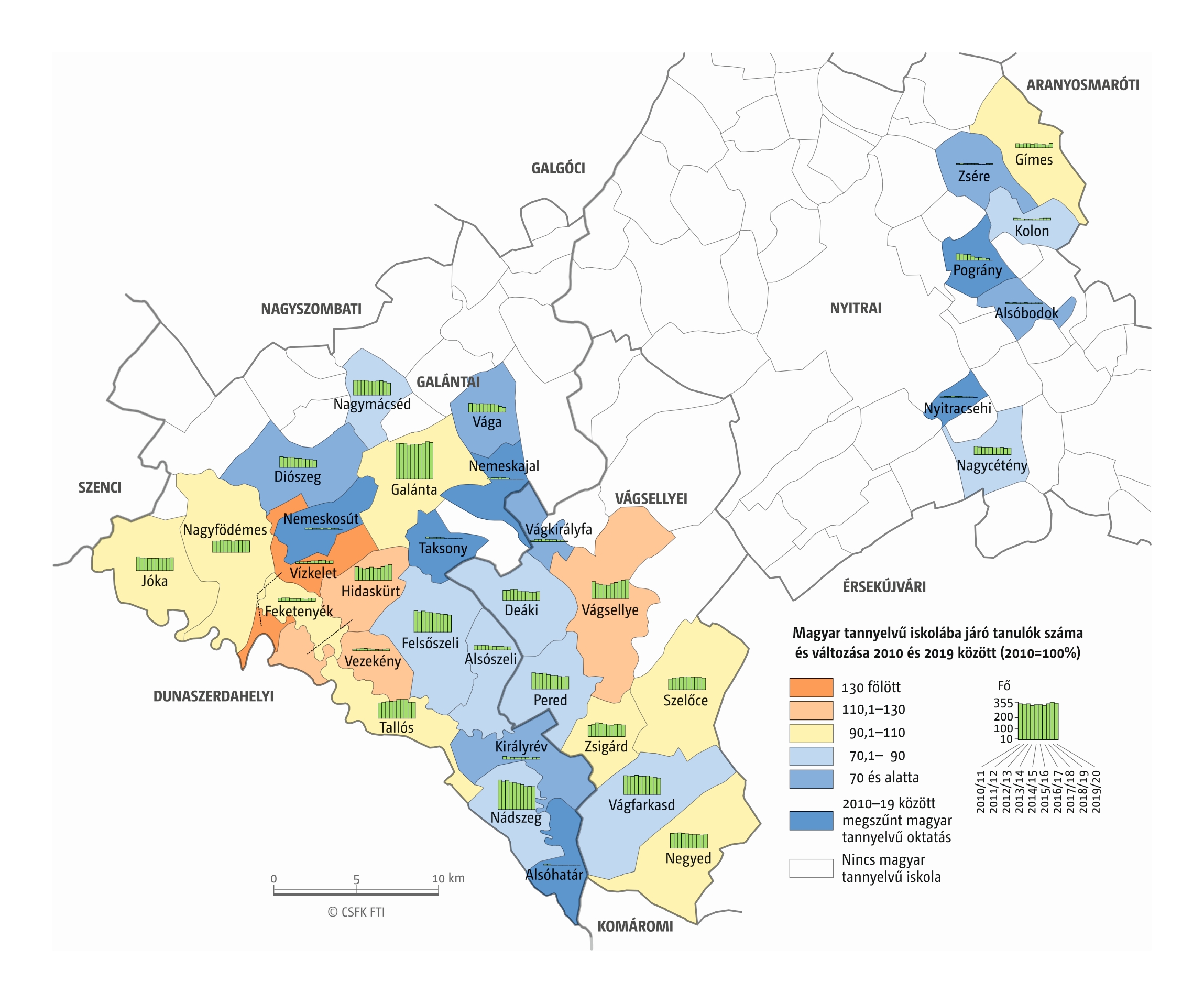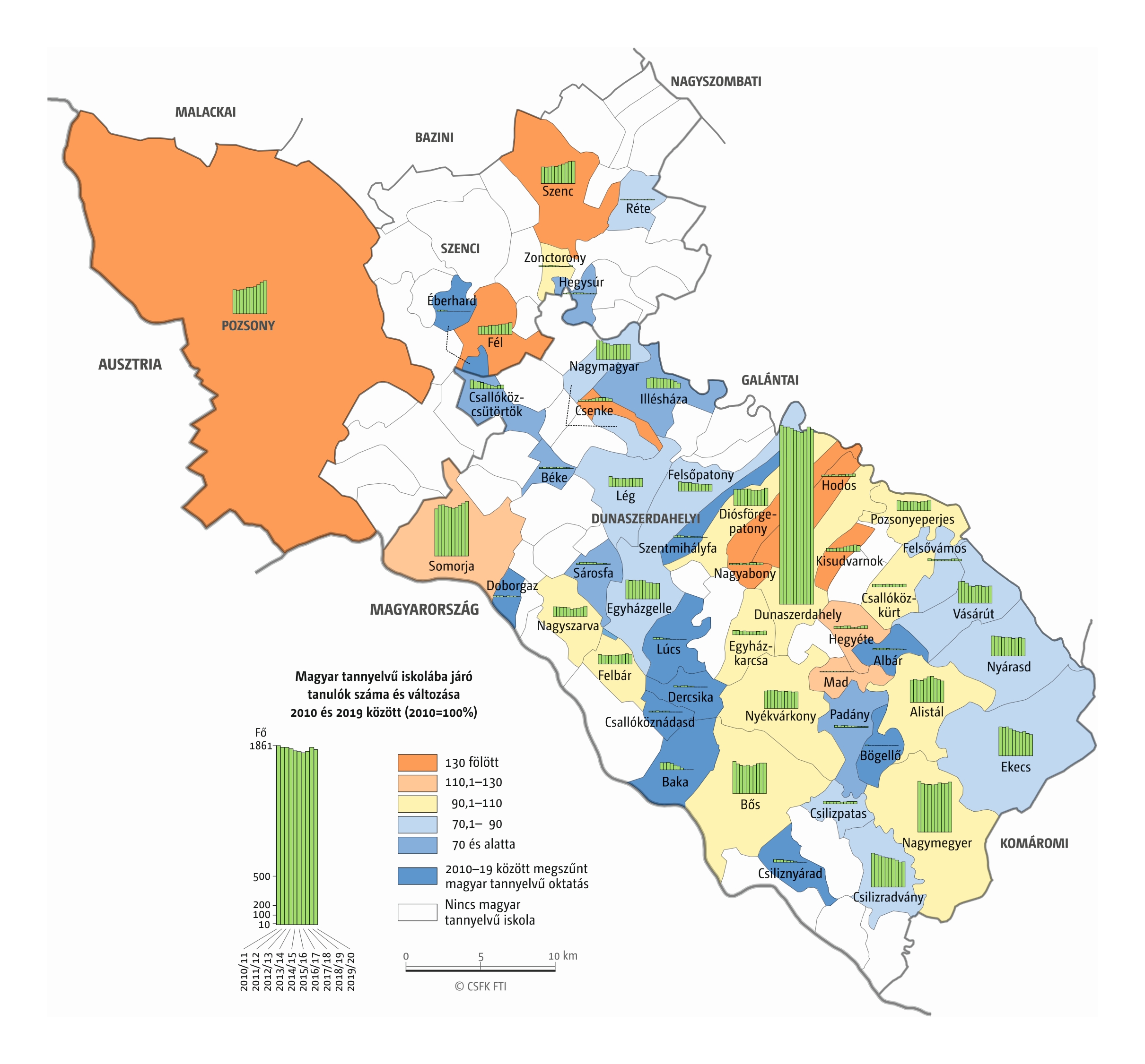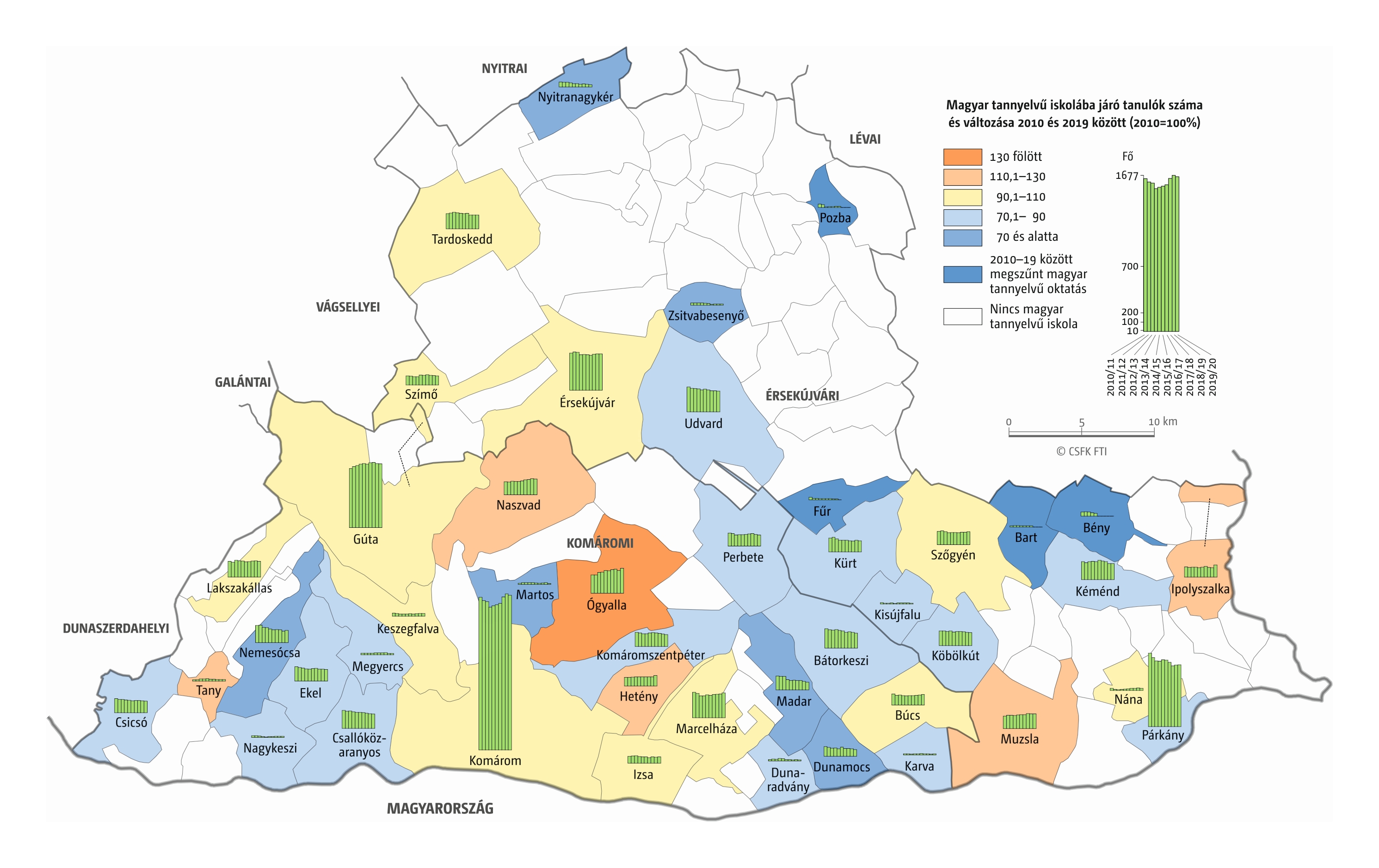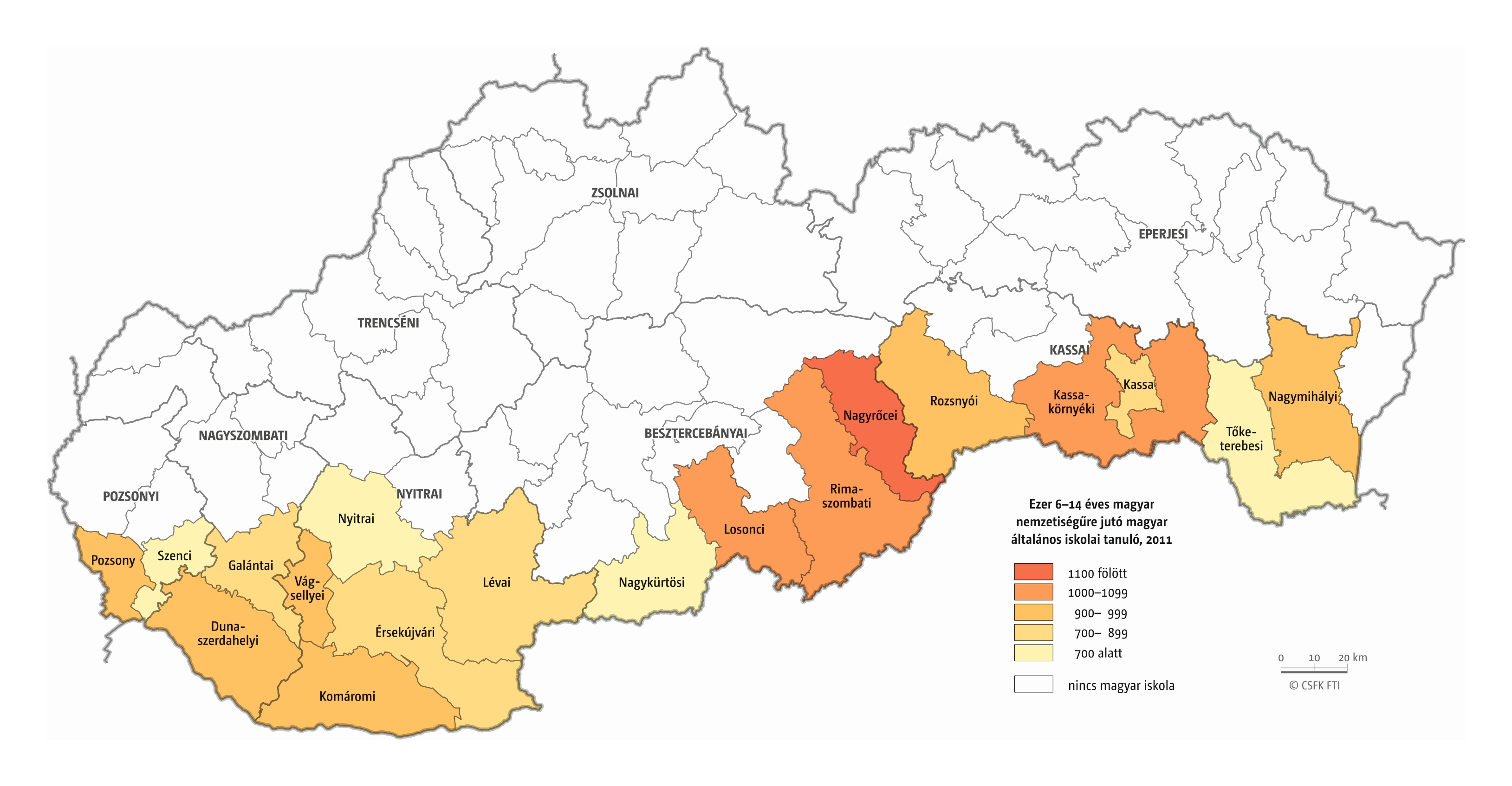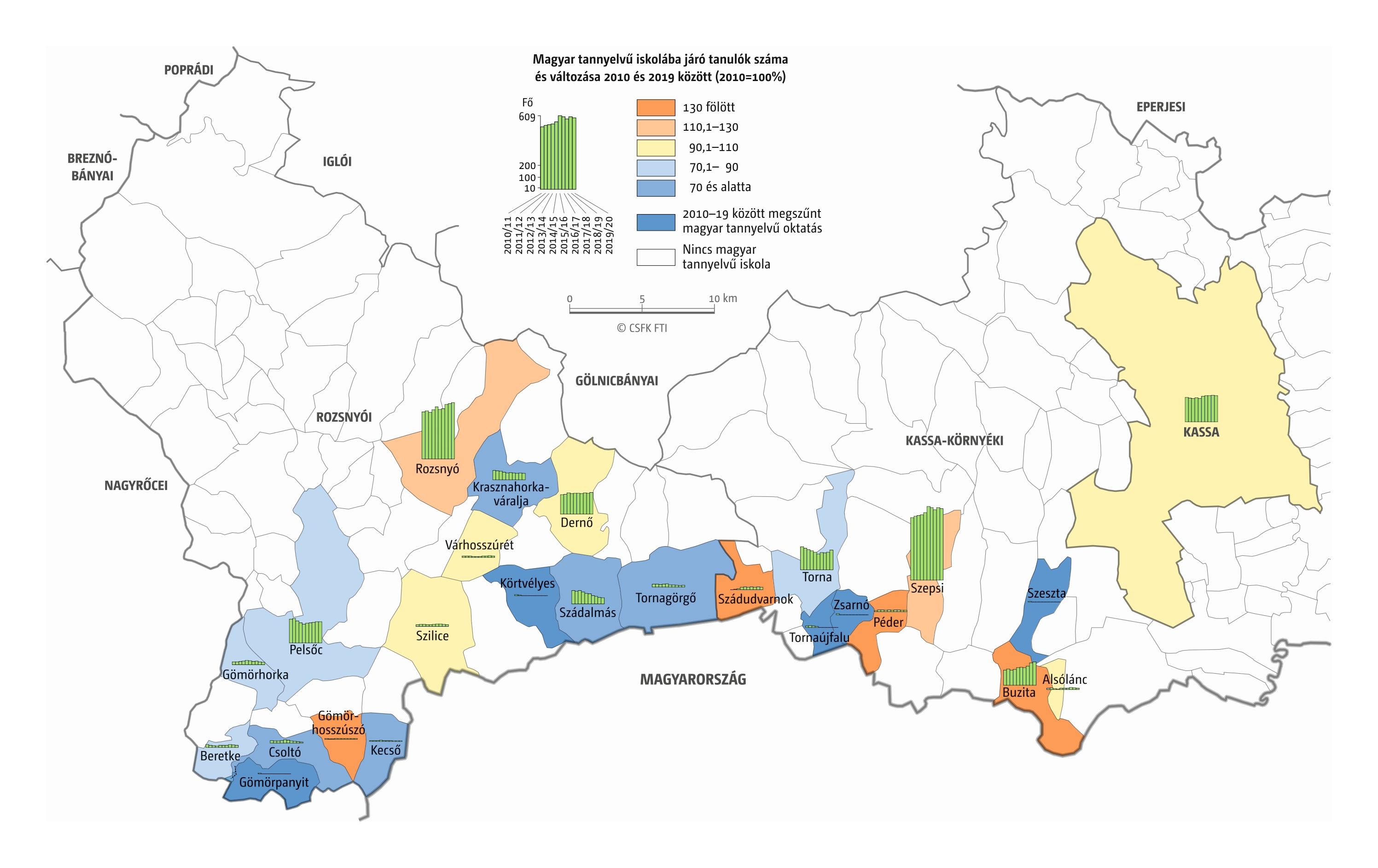 A települési szintű adatok értelmezésénél fontos figyelembe venni, hogy minél feljebb megyünk az oktatási szinteken, annál koncentráltabban jelennek meg a magyar diákok. Míg óvoda a legtöbb magyarlakta településen működik, addig a kistelepülések gyakran már nem tudnak eltartani egy általános iskolát, a középiskolák pedig többnyire városokban találhatók. Kivételek természetesen bőven találhatók: a Nyitrai járásban például 2011-ben 9 ezer magyarra egyetlen magyar óvoda, a koloni jutott, míg iskolából ekkor még hét is volt. De ugyanilyen meglepő, hogy a 2011-ben több mint kétezer magyar anyanyelvűnek otthont adó Tornában sincs magyar nyelvű óvoda, de magyar általános iskola igen.