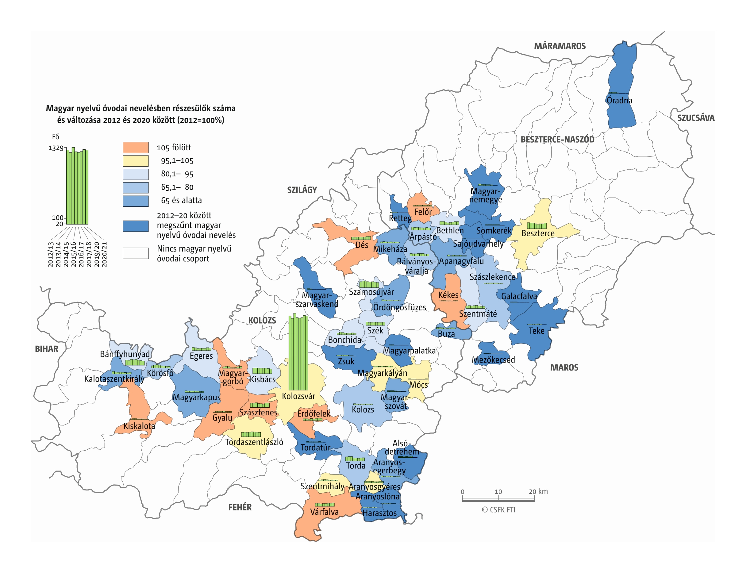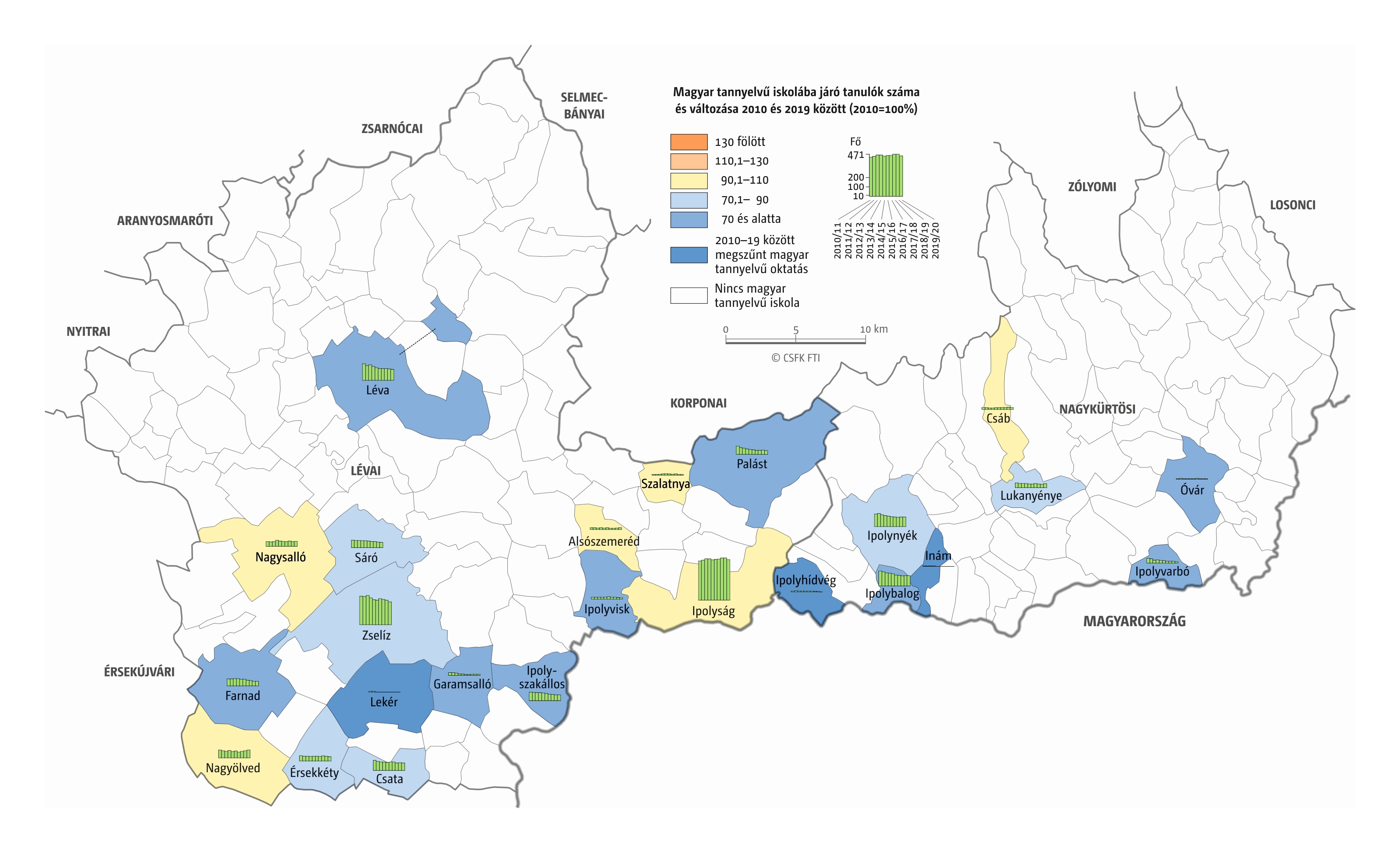 Fontos megjegyeznünk, hogy ha az első vagy az utolsó év kiugró értéket mutat a települési szinten bemutatott változások esetében, vagy ha nagyon alacsony a gyereklétszám (és emiatt már egy-két gyerek megjelenése/eltűnése alapvetően befolyásolja a százalékos változást mutató adatokat), az jelentősen torzíthatja a folyamatok értelmezését, vizualizációját. Ennek kiküszöbölésére a legtöbb esetben kiválóan alkalmasak a járási/megyei szintre aggregált adatok, amelyek általában több iskola adatait összesítik, illetve együtt jelenítik meg funkcionálisan összetartozó térségek (pl. város és vonzáskörzete) adatait. Kivételt jelentenek ez alól azok a szórványterületek, ahol egy járásban/megyében/körzetben mindössze egy-két intézmény adata jelenik meg (pl. a Szerémségben az egyetlen magyar iskola Maradékon található, ahol 2015 és 2019 között a tanulók száma 5 és 10 fő között mozgott). Ugyanígy a trendek érzékeltetését szolgálják azok a részletesebb, egy-egy kistérségre fókuszáló települési szintű térképek, ahol oszlopdiagramokon ábrázoltuk a vizsgált időszak minden évének tanulói létszámát. Ez utóbbi minden vizsgált országra mind az óvodai, mind az általános iskolai szintre elkészült, leszámítva a kárpátaljai óvodákat, ahol a kevés rendelkezésre álló adat miatt ilyen térképek nem készültek.