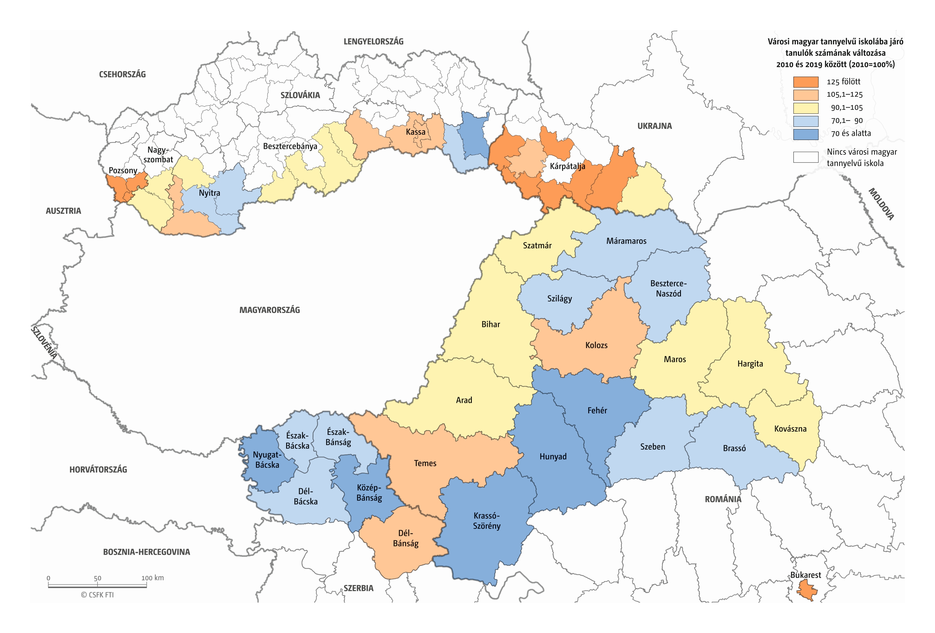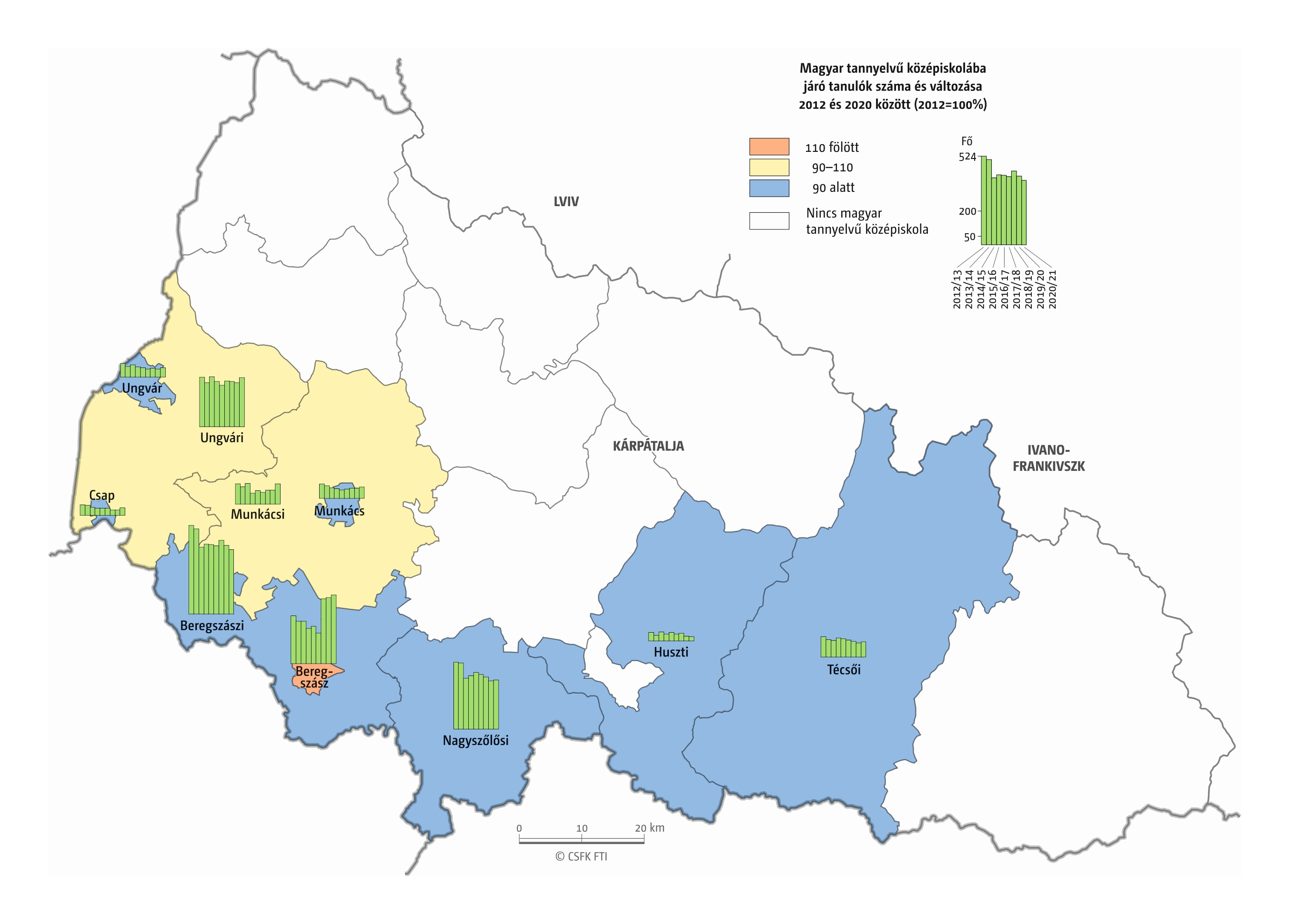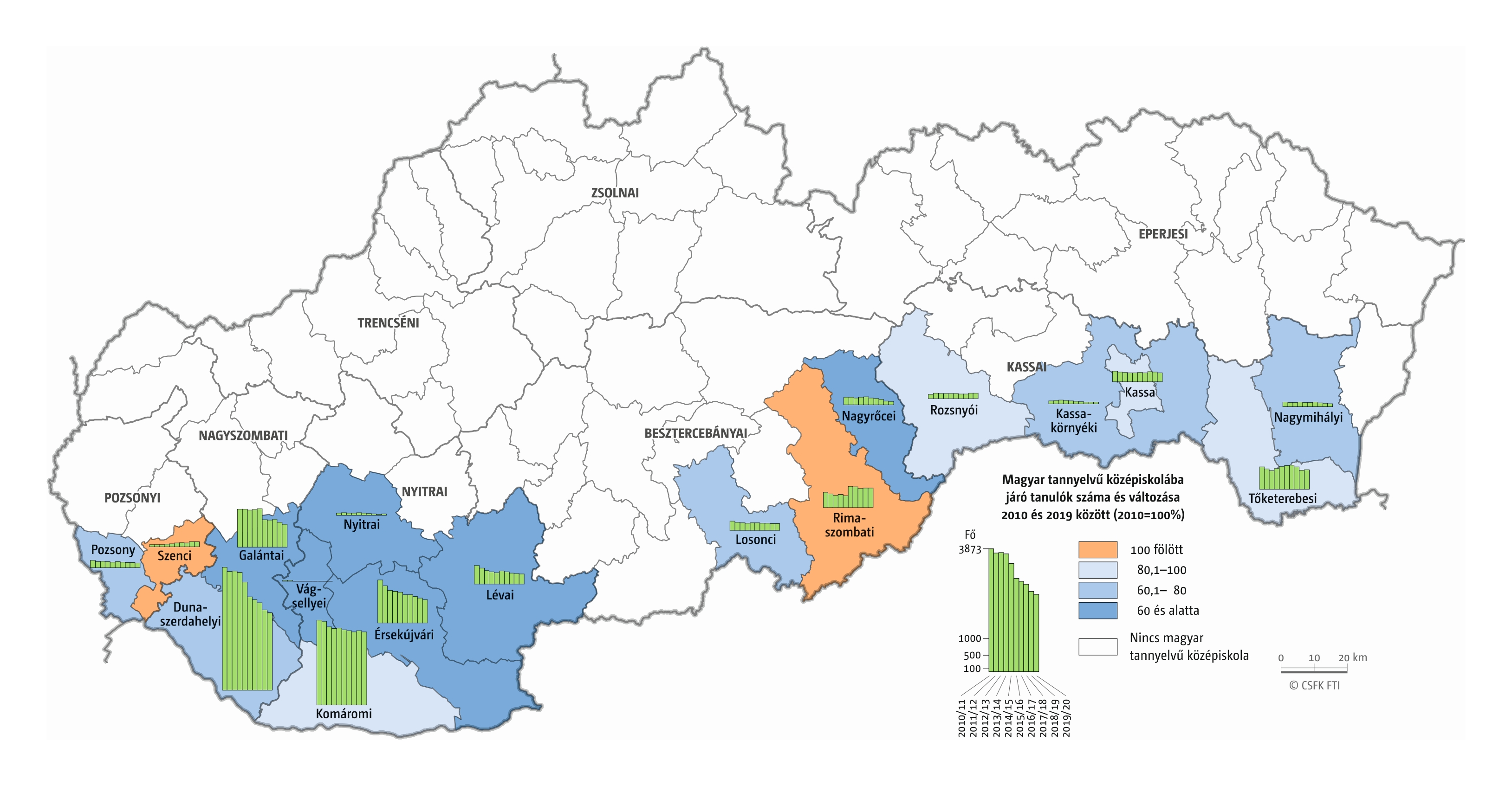 A határon túli magyar középiskolai tanulók száma 2010 és 2019 között jelentős mértékben, közel ötödével, 56 ezerről 45,3 ezerre csökkent. A csökkenés mértéke Szlovákiában és a Vajdaságban jelentősebb, Erdélyben és Kárpátalján mérsékeltebb volt. Szlovákiát leszámítva a középiskolai tanulók számának csökkenése volt jellemző lényegében az összes közigazgatási egységre (81. térkép). Dél-Szlovákiában ugyanakkor egyaránt megtalálhatók a növekedést mutató járások, és kiterjedt, drasztikus fogyással jellemezhető járáscsoportok is. A középiskolai tanulók esetében a magyarországi tanulmányok folytatása arányaiban jelentősebb, mint az általános iskolai tanulók esetében – a négy vizsgált országból származó tanulók összesített létszáma 2200–2800 fő között alakult a 2010-es években –, de mindez nem volt érdemi hatással a határon túli középiskolás tanulói kontingens csökkenésére, mivel a vizsgált időszakban a Magyarországon tanuló külhoni magyar középiskolás diákok száma is csökkent.