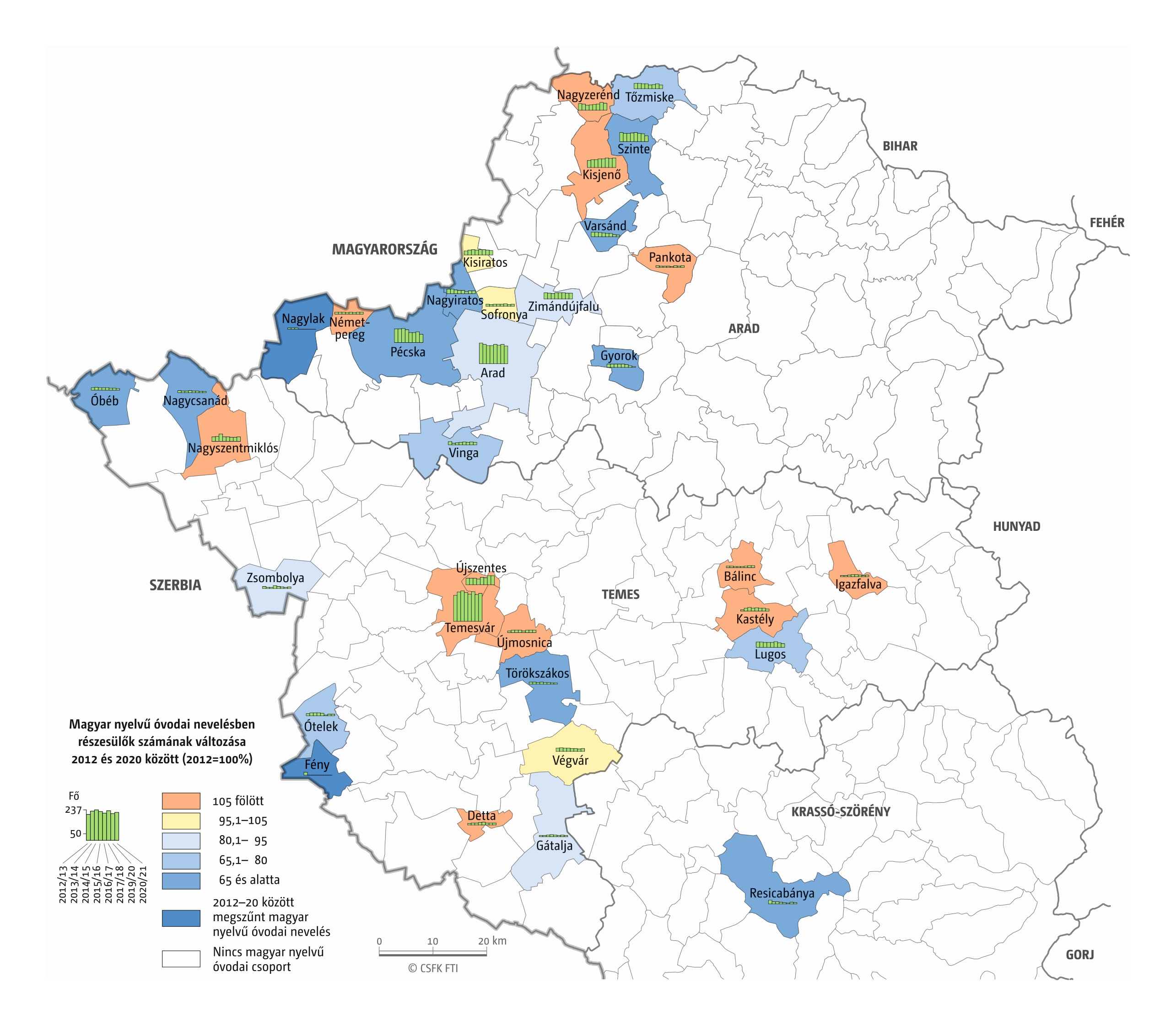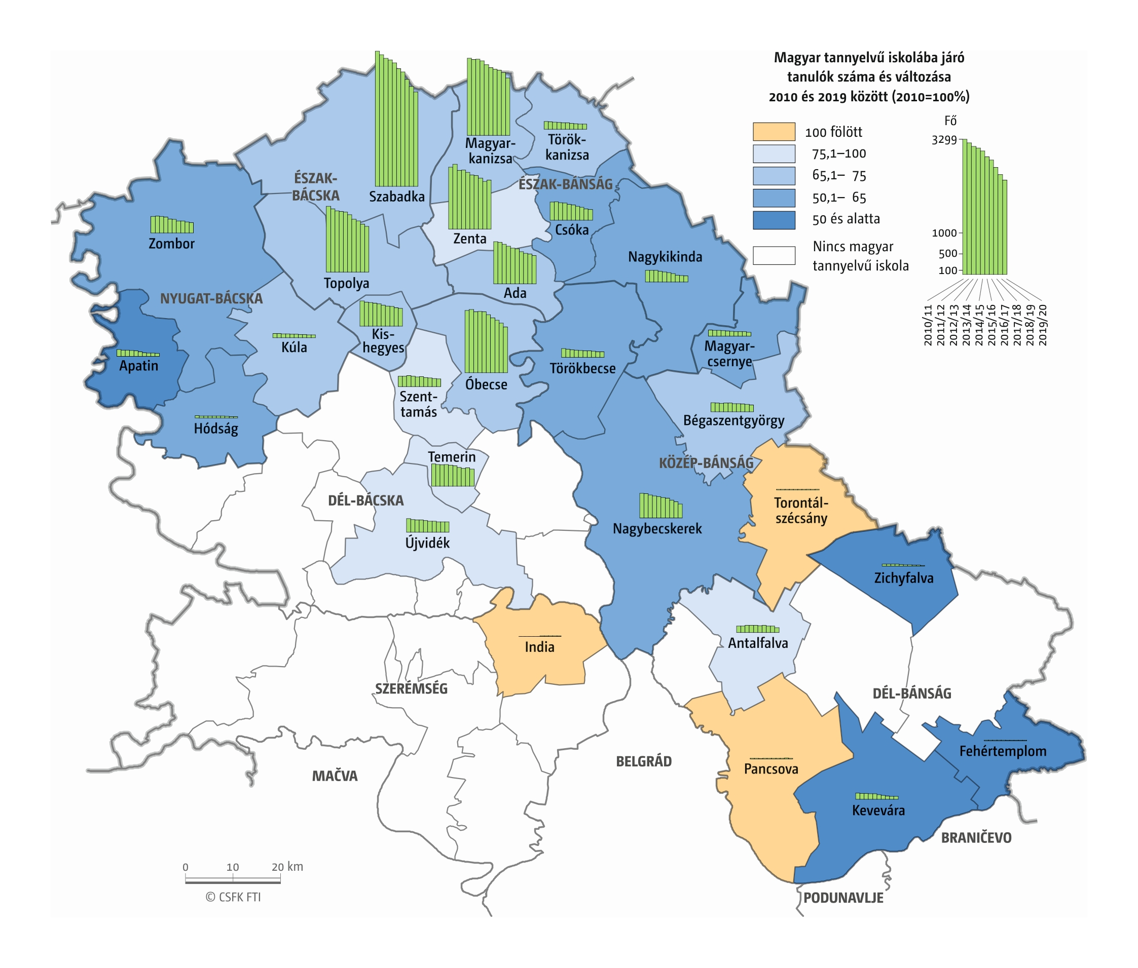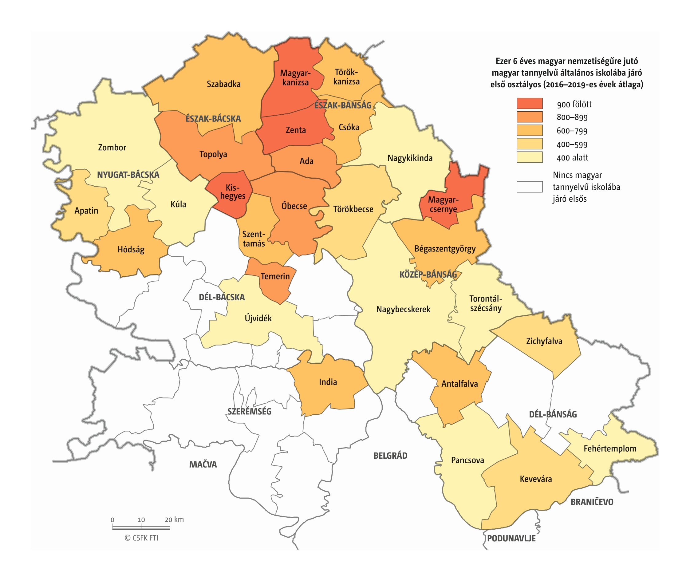A Vajdaság esetében részletes óvodai adatok csak a 2016–2019 közötti négy tanévre álltak rendelkezésünkre települési szinten. Az iskola-előkészítő csoportokba járók száma pedig csak községi szinten volt elérhető a 2010–19-es időszakra. (A vizsgált országok közül az ukrajnai, romániai és szerbiai területi adminisztrációban az alapfokú közigazgatási egységek az egy vagy több településből álló községek. Ezek mérete változatos, Romániában és – a 2020-as közigazgatási reform óta – Ukrajnában általában pár település, míg Szerbiában a magyarországi járásnak megfelelő méretű.)