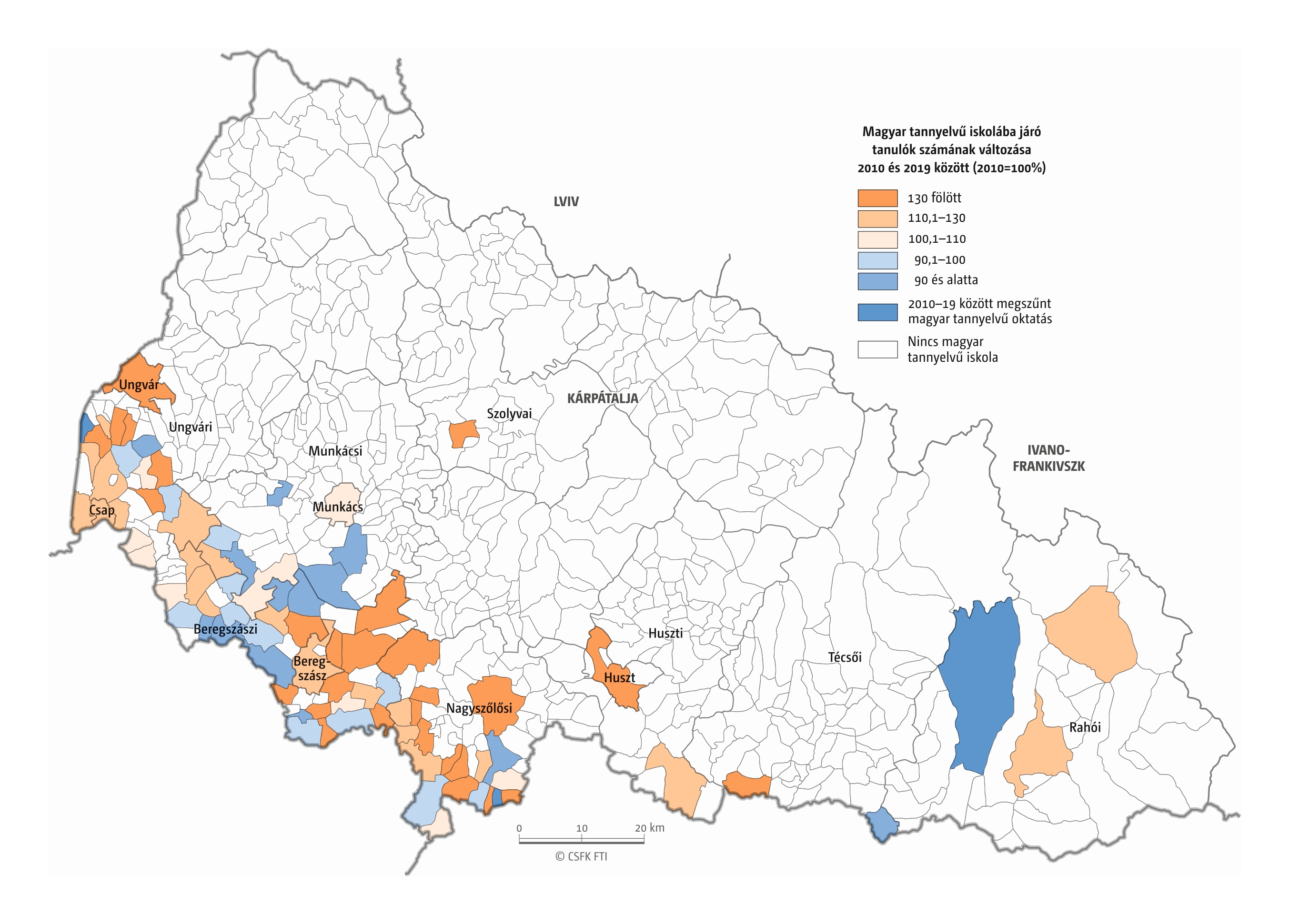 82. térkép: A külhoni magyar tannyelvű iskoláztatásban részesülő tanulók számának változása a Kárpát-medencében, 2010–2019