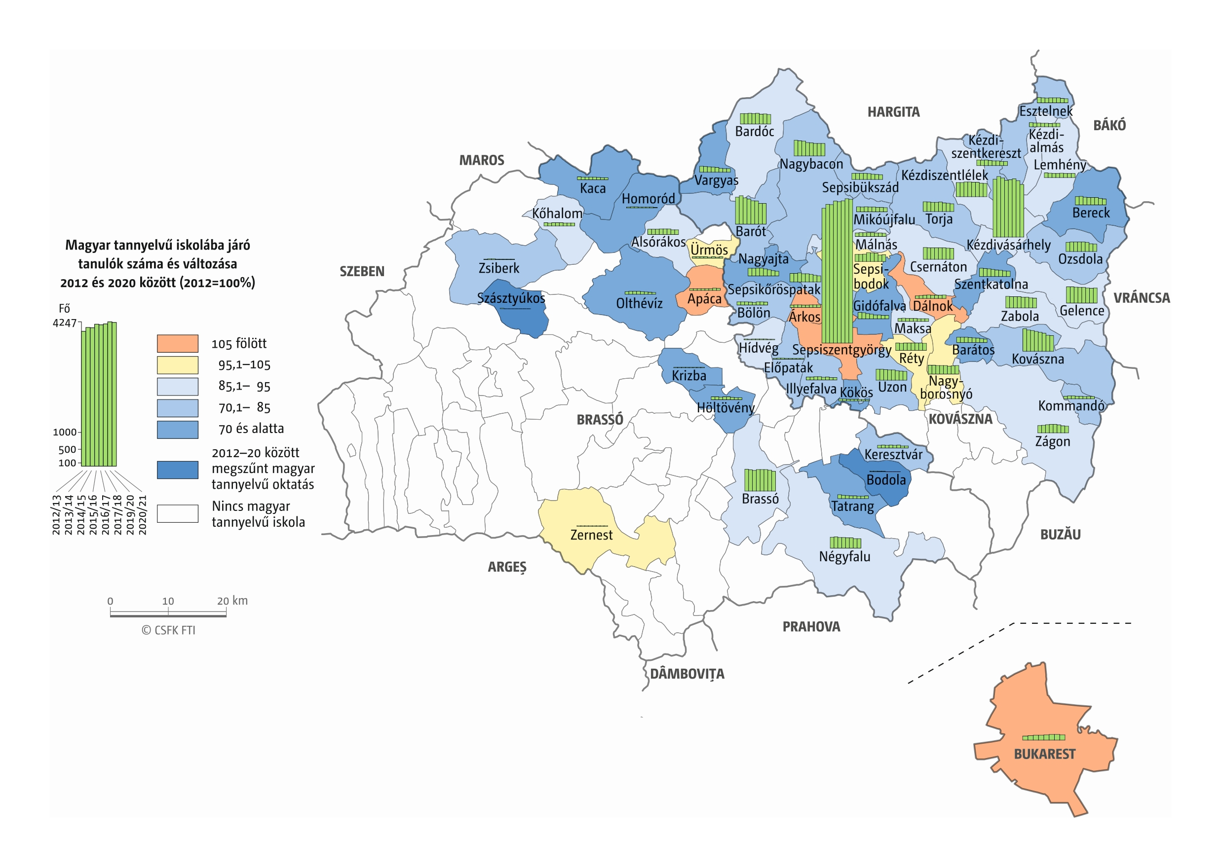 Romániában összesen 17 megyében és a fővárosban van magyar tannyelvű oktatás. Ez gyakorlatilag az erdélyi megyéket jelenti, a Kárpátokon túli megyék közül Bákóban működik magyar nyelvű oktatás – itt is mindössze egyetlen, a Székelyföldhöz kapcsolódó, de közigazgatásilag 1950-ben Bákóhoz csatolt község (a romániai és szerbiai község fogalmának a magyarországitól eltérő tartalmát ld. a Módszertan című fejezetben), Gyimesbükk érintett –, valamint Bukarestben. A minisztériumi adatok alapján a 2020/21-es tanévben három székelyföldi megye összesíti a magyar tannyelvű óvodai és iskolai oktatás 60,7%-át.