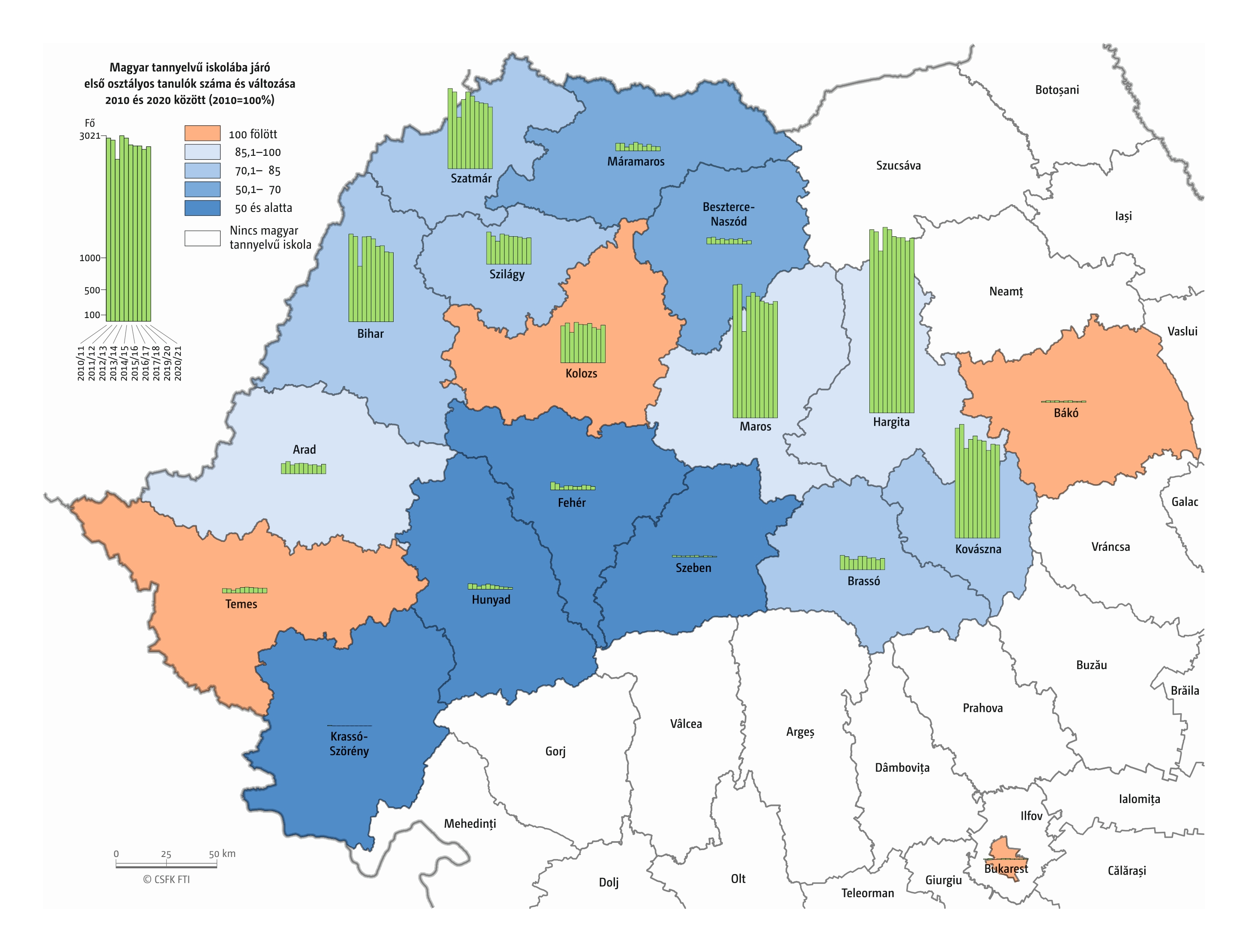 Hasonlóan jártunk el, amikor összevetettük a magyar iskolák elsőseinek számát és a hat évvel korábban született magyar nemzetiségűnek regisztráltak számát. Mivel itt sem esnek egybe az iskolaévek szerint rendelkezésre álló oktatási statisztikák és a naptári évek szerint gyűjtött népmozgalmi adatok, továbbá sok gyerek kezdi 7 éves korban az iskolát, valamint a születések számának éves ingadozása jelentős lehet, ezért a 2016–2019 közötti tanévek átlagos adatait vetettük össze a 2010–2013 közötti születések átlagával. Ez tehát szintén csak egy közelítő érték, de a főbb trendekről, az adott országon belüli regionális eltérésekről megfelelő képet ad.