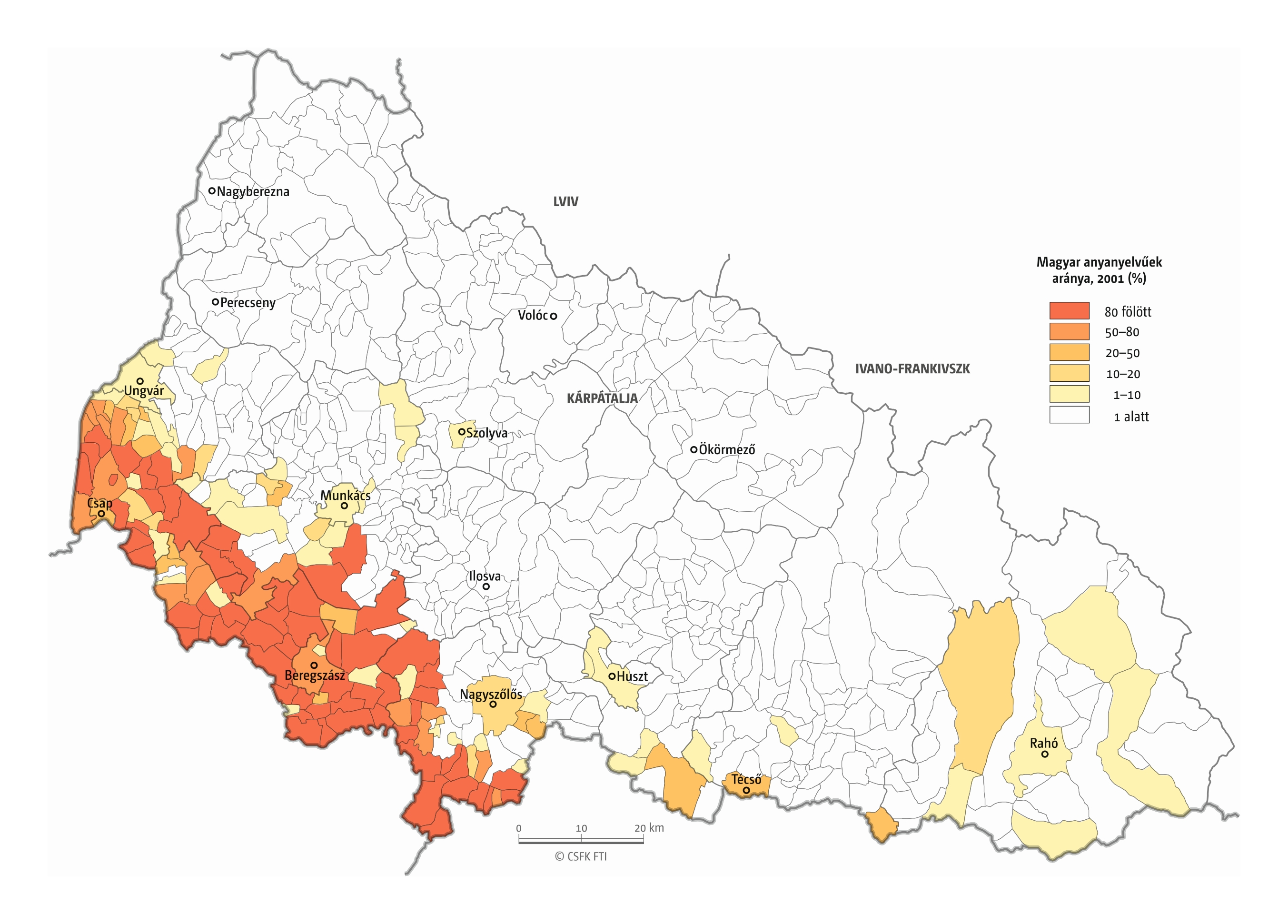 87. térkép: A magyar anyanyelvűek aránya Kárpátalja településein, 2001