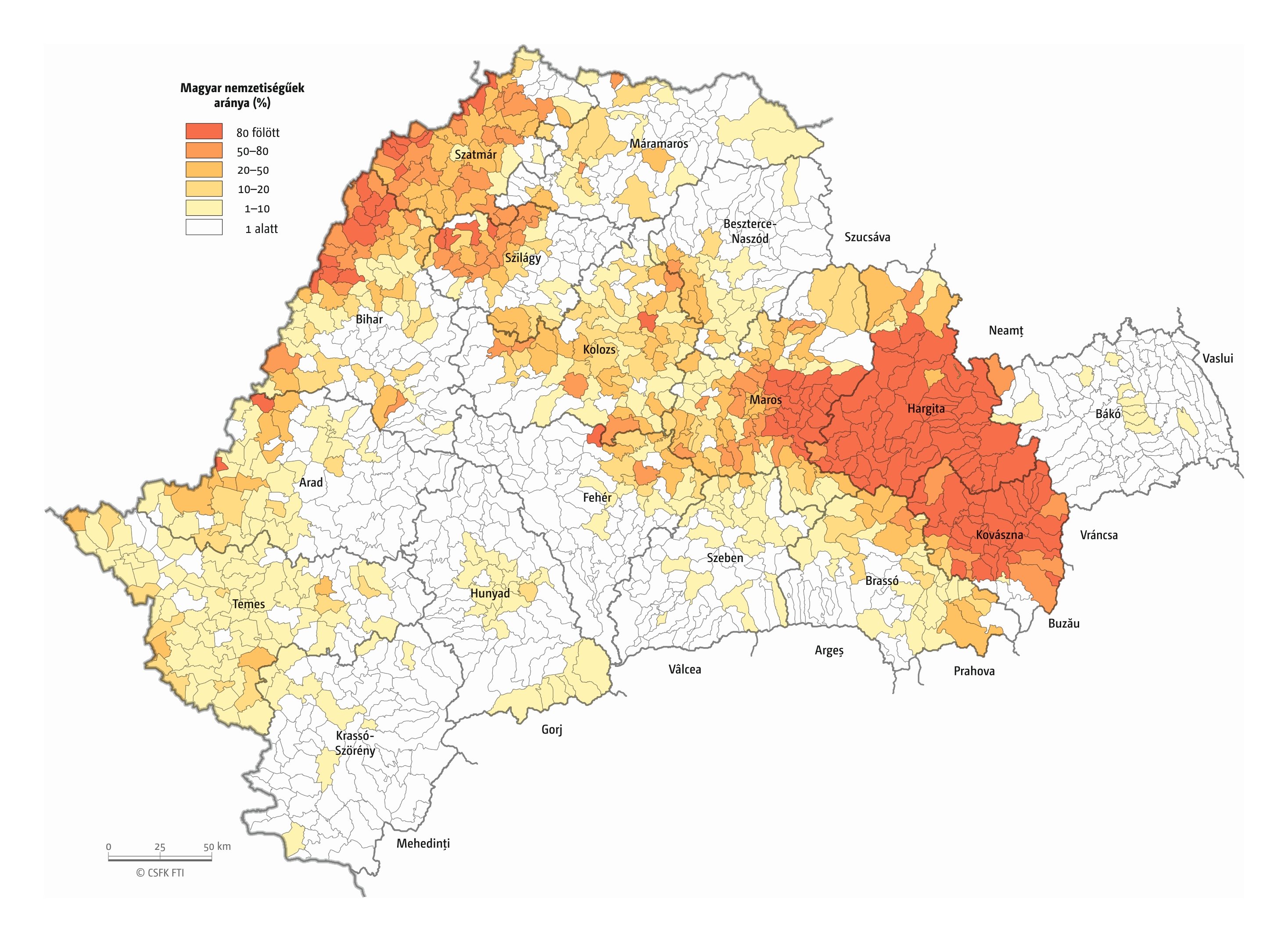 90. térkép: A magyar anyanyelvűek aránya a Kárpát-medence vizsgált területein, 2011