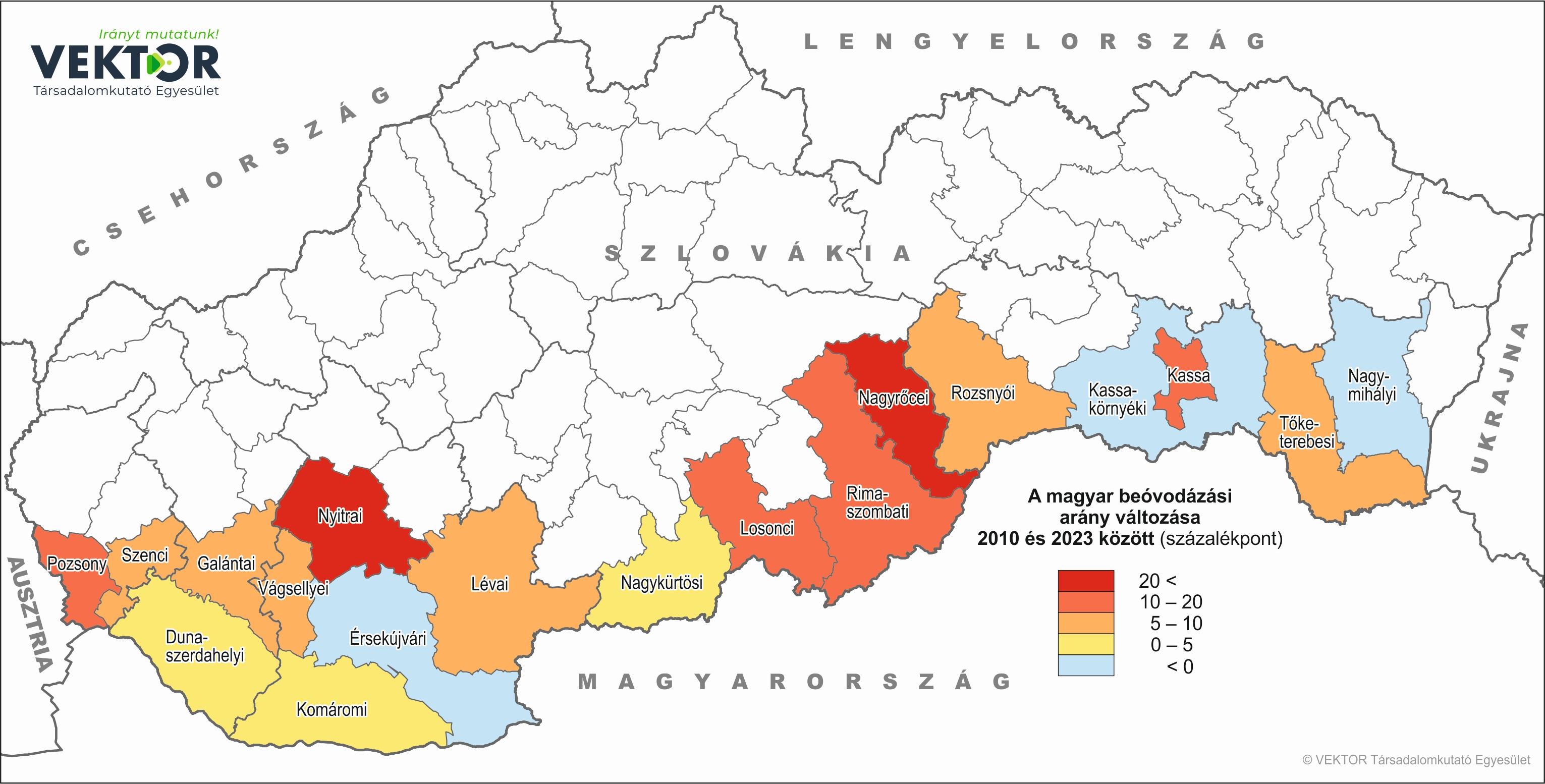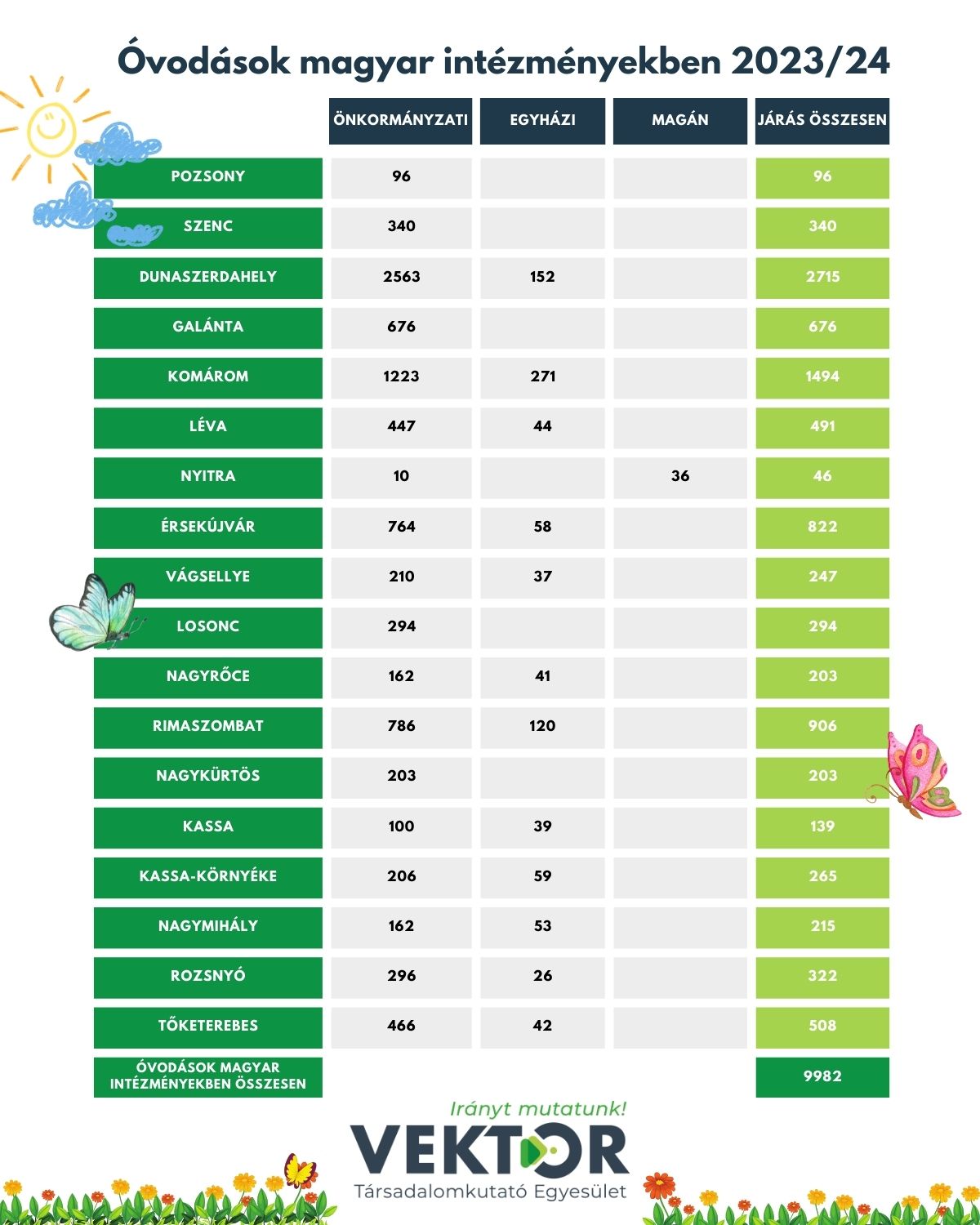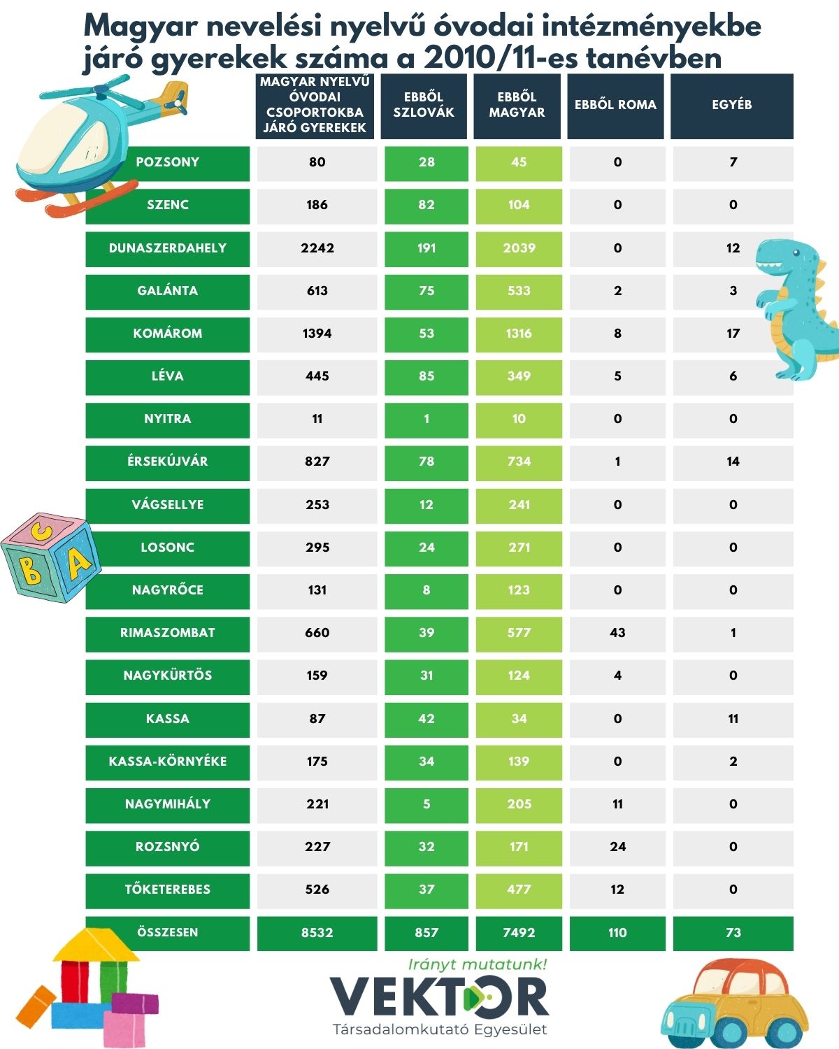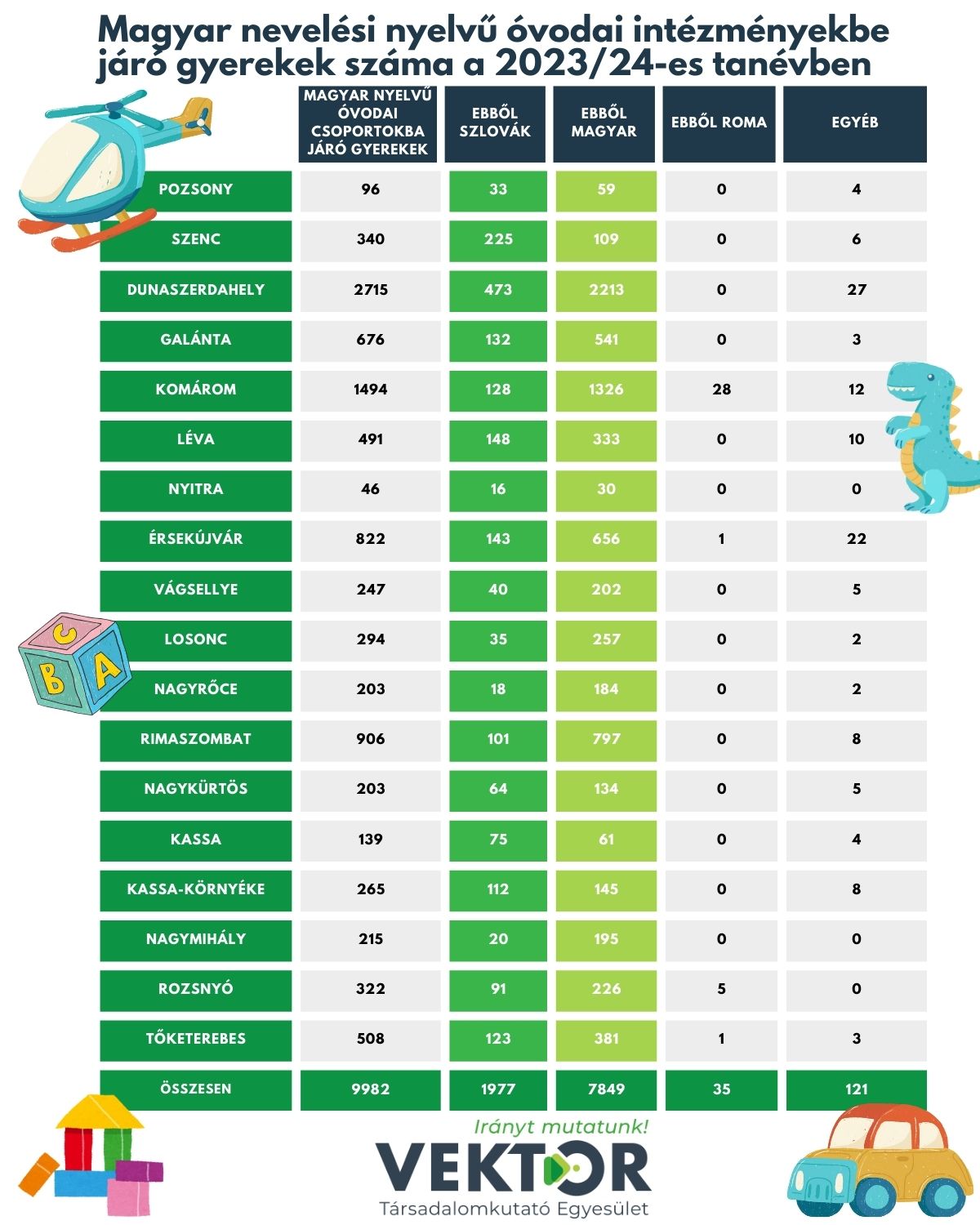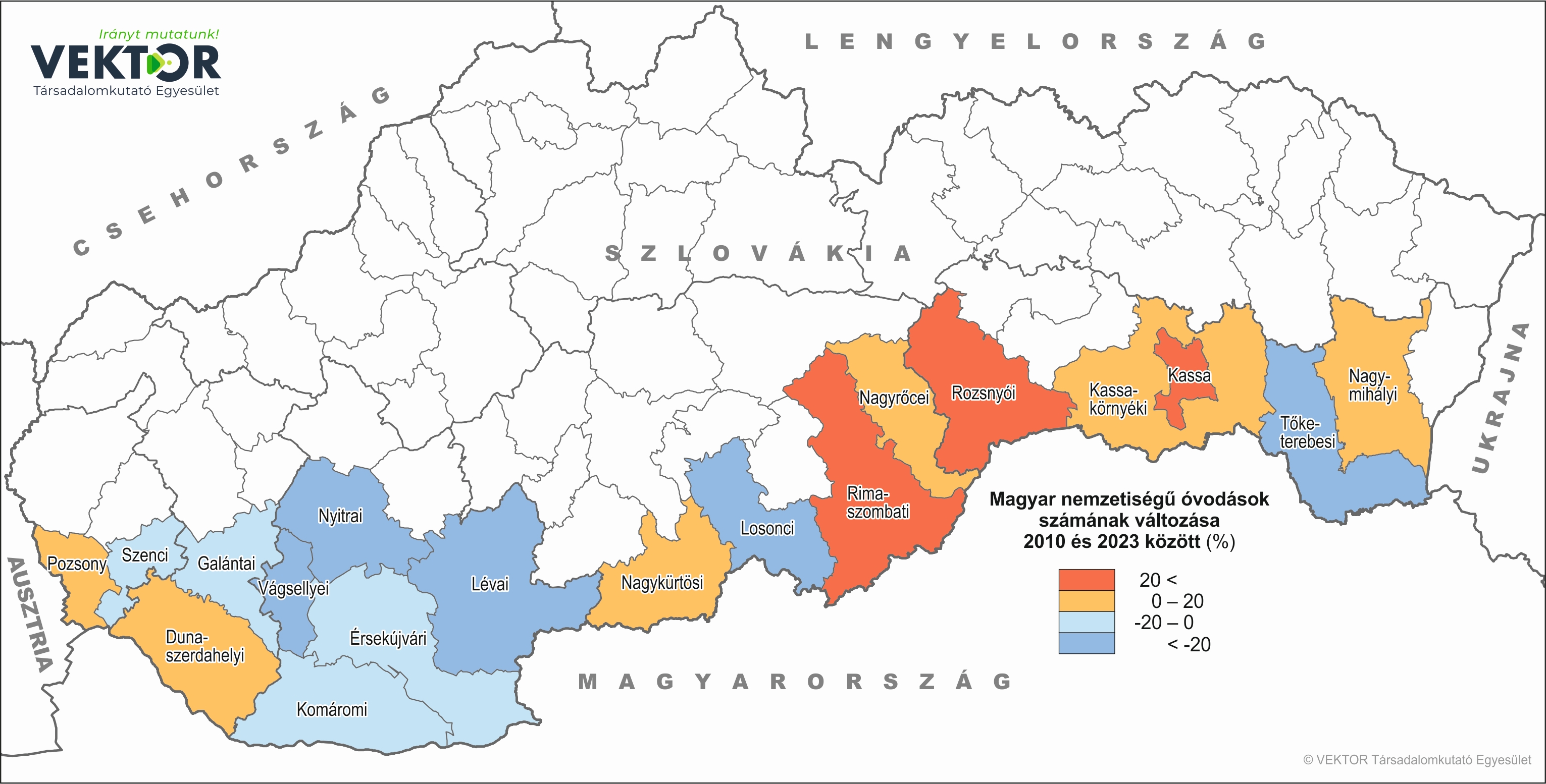 A magyar nevelési nyelvű óvodai intézményeket látogató gyerekek száma nőtt tehát, de ez nem jelenti azt, hogy a magyar nemzetiségű óvodások száma is hasonló mértékben nőtt. Sőt, az adatok alapján 2010 és 2023 között 3%-kal, 9952-ről 9672-re csökkent a számuk, ami tehát azt mutatja, hogy a kedvező beóvodázási adatok mögött nem állnak szükségszerűen kedvező demográfiai folyamatok. A magyar nemzetiségű óvodások számának változása területileg egyenlőtlenül zajlott le. A nyugati járások közül (Pozsonytól a Lévai járásig) csak Pozsonyban és a Dunaszerdahelyi járásban pozitív előjelű a magyar nemzetiségű óvodások számának a változása, ezekben a közigazgatási egységekben elsősorban az országon belüli migráció, illetve ennek egy speciális válfaja, a szuburbanizáció járult hozzá a gyerekszám növekedéséhez. Szintén a belső migráció eredménye a kassai magyar nemzetiségű óvodások számának kiugró, másfélszeres növekedése. A Nagykürtösi járástól az ukrán határig található járások közül viszont csak a Losonci és a Tőketerebesi járásban csökkent a magyar nemzetiségű óvodások száma, ellenben a Rimaszombati és a Rozsnyói járásokban a növekedés üteme a 10%-ot is meghaladta. A keleti járásokban a kedvezőbb adatok hátterében elsősorban a magyar nemzetiségű roma gyerekek számának növekedése áll.