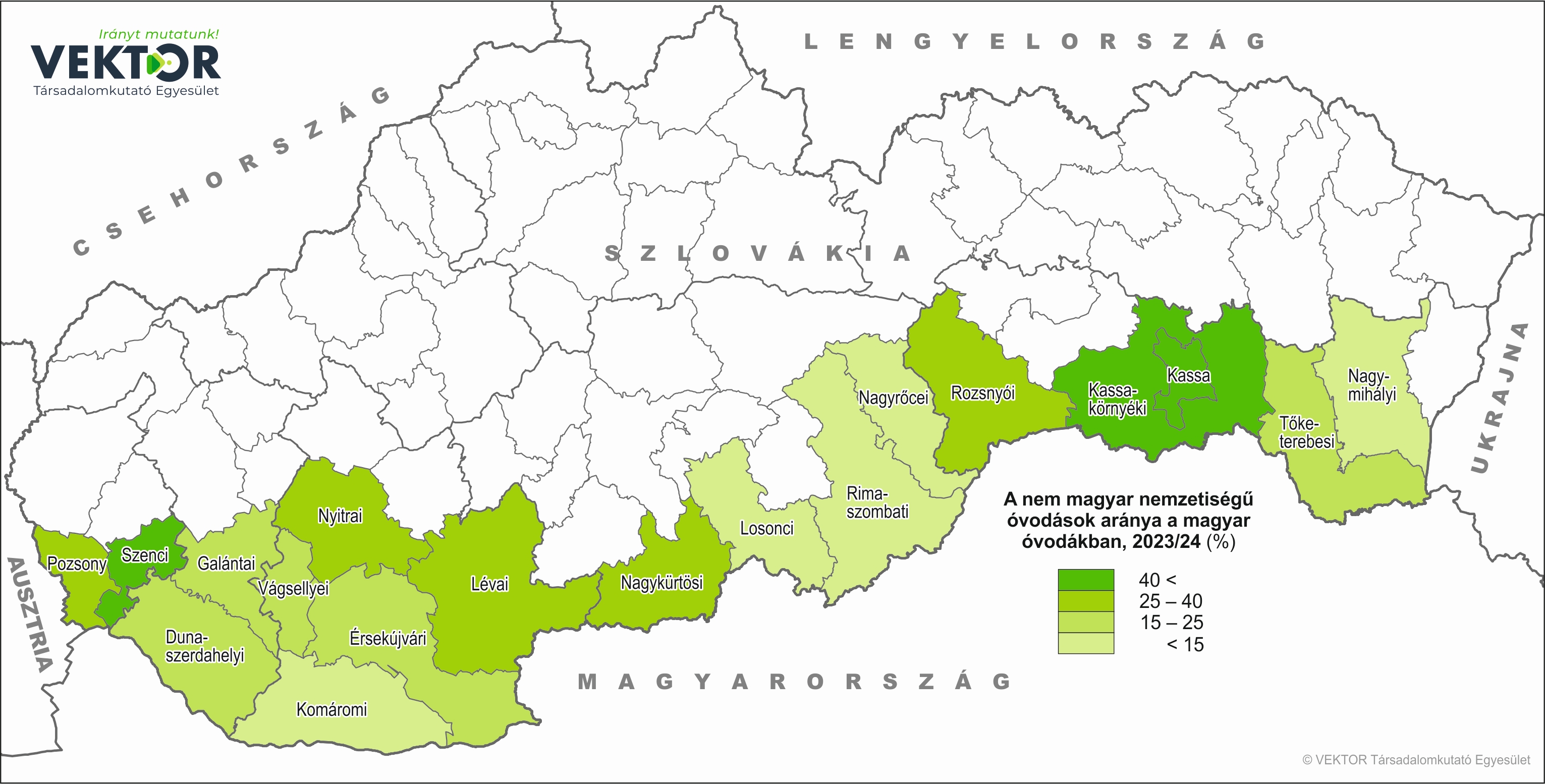 A magyar óvodába járó gyerekek száma tehát nőtt, de a magyar nemzetiségűeké ezzel egyidejűleg csökkent. Ebből az következik, hogy a magyar óvodákba jelentős számban járnak nem magyar nemzetiségű gyerekek. A 2023/24-es tanévben a 9982 magyar óvodába járó gyerek közül 2133 (21,4%) nem magyar nemzetiségű volt. Többségüket (1977 fő) szlovákként regisztrálták. A roma nemzetiségűek száma meglepően alacsony volt, és leginkább a Komáromi járásban éltek (az összesen regisztrált 35-ből 28-an). Természetesen ennél jelentősen több roma gyerek jár magyar óvodába, ők azonban többnyire – ahogy a népszámlálásokon is – magyarként lettek regisztrálva. A nem magyar nemzetiségű óvodások magyar óvodákban való megjelenése elsősorban a nyelvhatár környékén (főként a szórványban és a nagyvárosokban) jellemző. Itt a vegyes házasságok aránya magasabb, ennek megfelelően több vegyes házasságból származó, szlovák nemzetiségűként regisztrált gyerek jelenik meg a magyar óvodákban. Különösen magas az arányuk a Szenci járásban és Kassán, ahol a magyar óvodába járók többsége szlovák nemzetiségű. Ennek ellenpontját a tömbterületek, illetve a kompakt magyar településterülettel jellemezhető keleti járások adják. Utóbbiak közül a Nagyrőcei és Nagymihályi járásokban a magyar óvodába járó nem magyarok aránya a 10%-ot sem éri el.