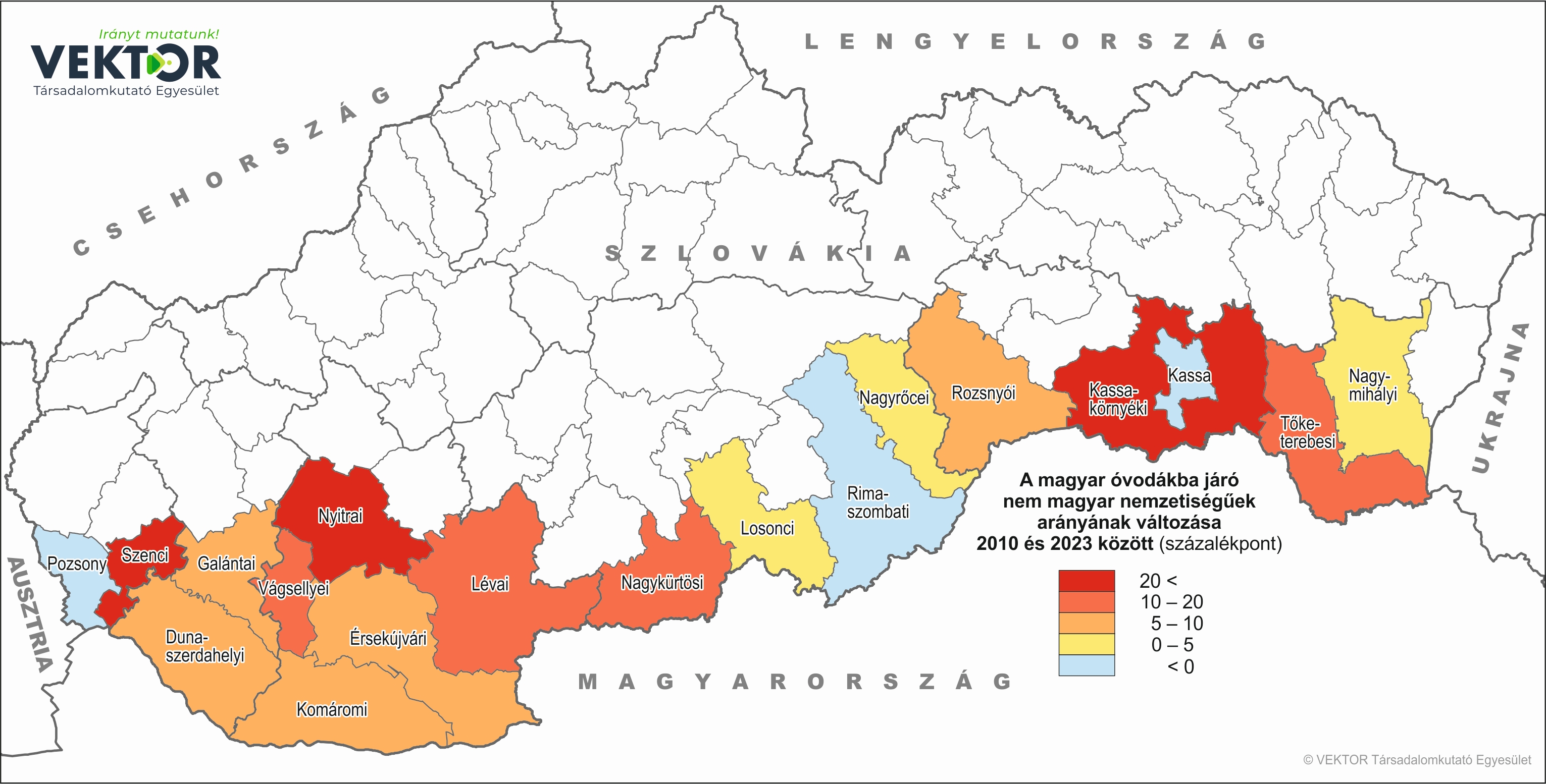 A 2010/11-es tanévben a magyar óvodába járó 8532 gyerek 12,2%-a, azaz 1040 gyerek volt nem magyar nemzetiségű. 2010 és 2023 között tehát a nem magyarok száma és aránya közel duplájára nőtt. Míg 2010-ben a nem magyarok 82%-a volt szlovák nemzetiségű, addig 2023-ban már 93%. Mindez arra hívja fel a figyelmet, hogy a vegyes házasságok szerepe nőtt a magyar óvodai rekrutációban. A változások területileg differenciáltan mentek végbe. A két nagyvárosban, Pozsonyban és Kassán az általános tendenciával szemben 5 százalékponttal csökkent a nem magyarok részesedése, ami annak köszönhető, hogy ezekben a városokban már 2010-ben is magas volt a nem magyarok aránya, amit a magyar tömbterületekről való bevándorlás valamelyest csökkentett. Hasonlóképp, bár minimális mértékben csökkent a nem magyarok aránya a Rimaszombati járásban, itt azonban inkább a magyarként regisztrált roma népességgel hozható összefüggésbe a változás. A nem magyar nemzetiségűek aránya a legnagyobb mértékben a szórványosodó, nyelvhatármenti térségekben (sorrendben a Nyitrai, Kassa-környéki és Szenci járásokban) nőtt, rávilágítva az asszimiláció, a vegyesség szerepére a magyar intézmények életében.