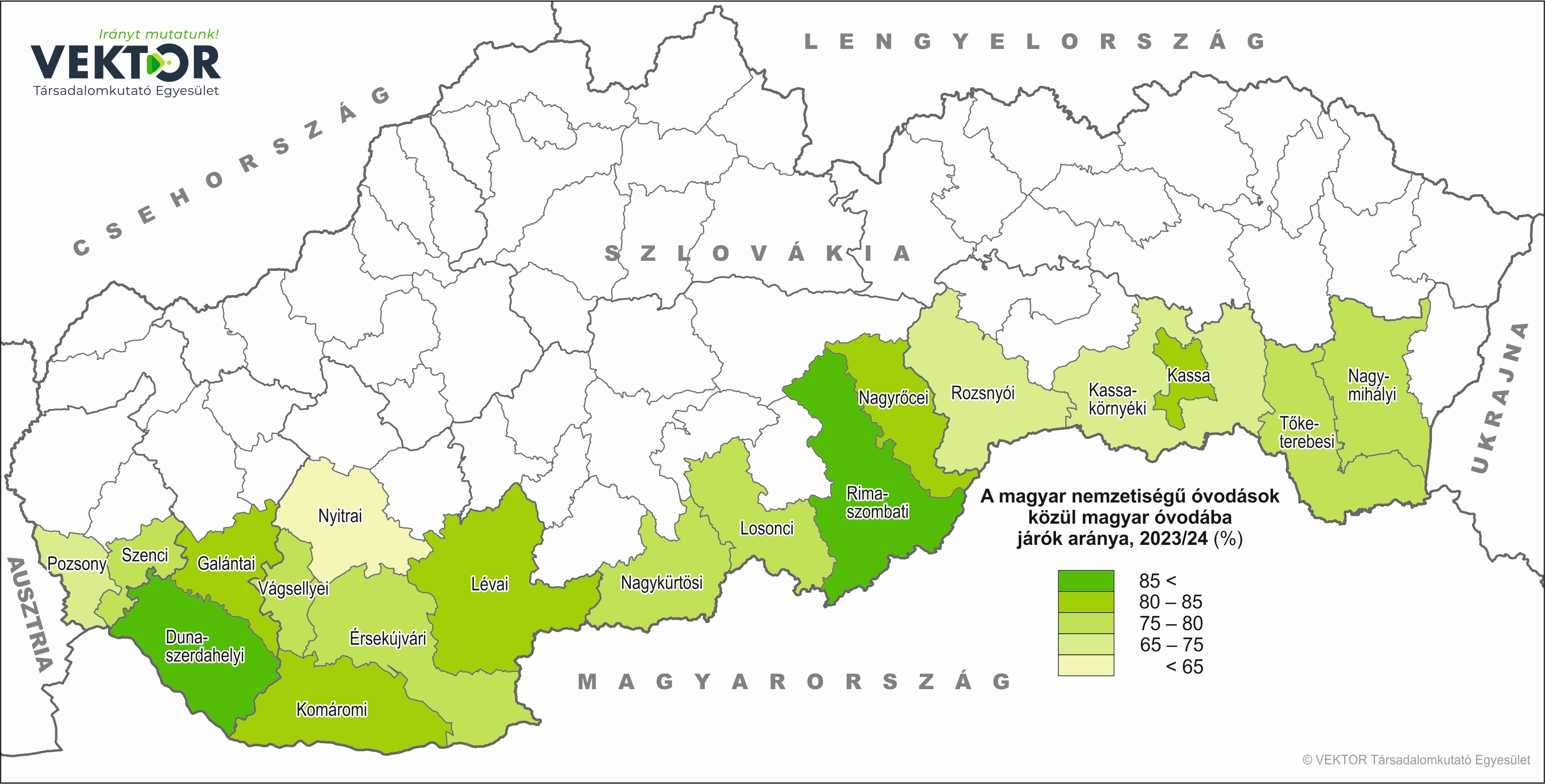 Tény, nem minden magyar nemzetiségű gyerek jár magyar óvodába, így fontos megvizsgálnunk, hogy a magyar gyerekek mekkora hányada jár magyar óvodába. A 2023/24-es tanévben 7849 magyar gyerek járt magyar óvodába, viszont 1823-an más óvodába jártak. Összesen tehát a magyar gyerekek 81,2%-a járt magyar nyelvű óvodába. Érdemes azonban megjegyeznünk, hogy a nem magyar intézménybe járó magyar gyerekek között ugyanúgy találunk vegyes házasságból származókat, mint ahogy a magyar óvodába járó nem magyarok között. A magyar gyerekek magyar óvodába történő beóvodázási arányát leginkább a tömb–szórvány kettősség határozza meg. A legmagasabb érték a magyar etnikai tömbterületeket jellemzi. Kiemelkedik a Dunaszerdahelyi járás (88%), de magas az arány a Rimaszombati (85%), a Komáromi és a Nagyrőcei járásokban (82–82%) is. A skála másik végpontján a Nyitrai járás található, ahol a magyar gyerekek többsége – részben a kevés elérhető magyar óvoda miatt – nem magyar óvodába jár. Szintén alacsony a vizsgált érték a szórványosodó Kassa-környéki járásban, Pozsonyban és a Rozsnyói járásban. Utóbbi negatív irányban lóg ki, ugyanis etnikai szerkezete és a magyarok járási aránya alapján ez egy nagyon alacsony érték. Ugyanakkor pozitív irányban tér el a várttól Kassa, ahol a magyar gyerekek 80%-a magyar óvodába jár, ami így 13 százalékponttal több, mint a hasonló adottságú Pozsony értéke.