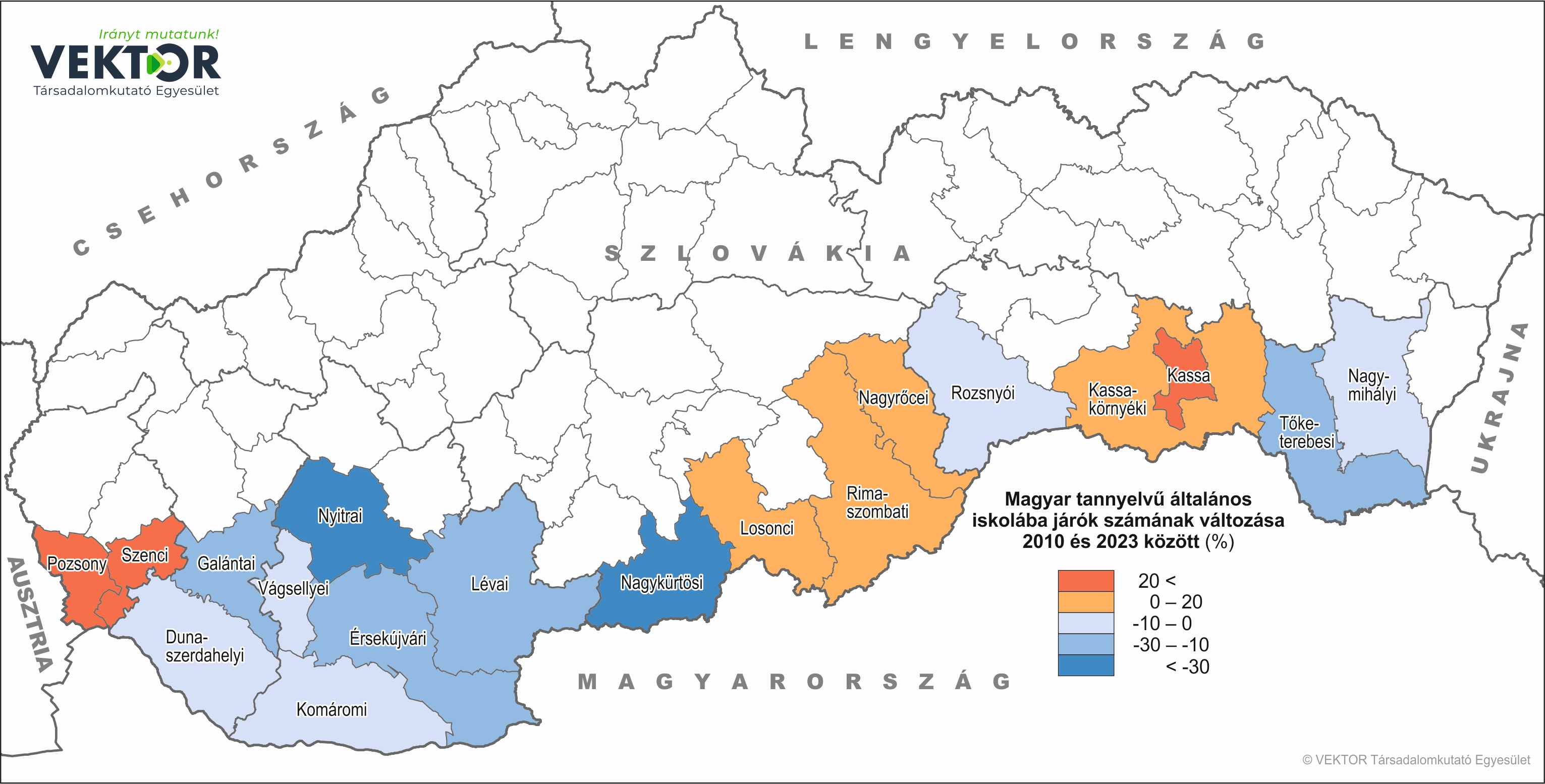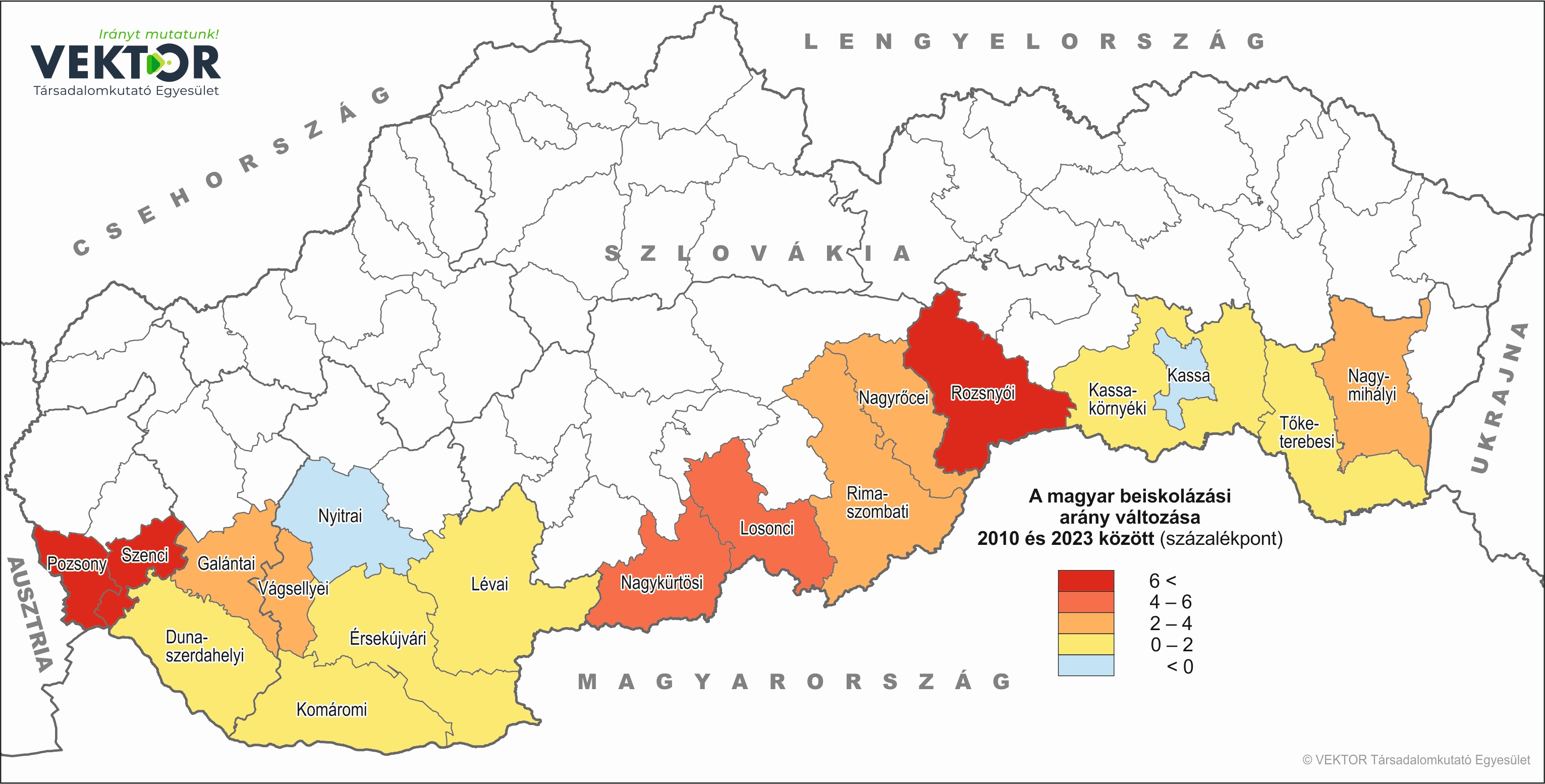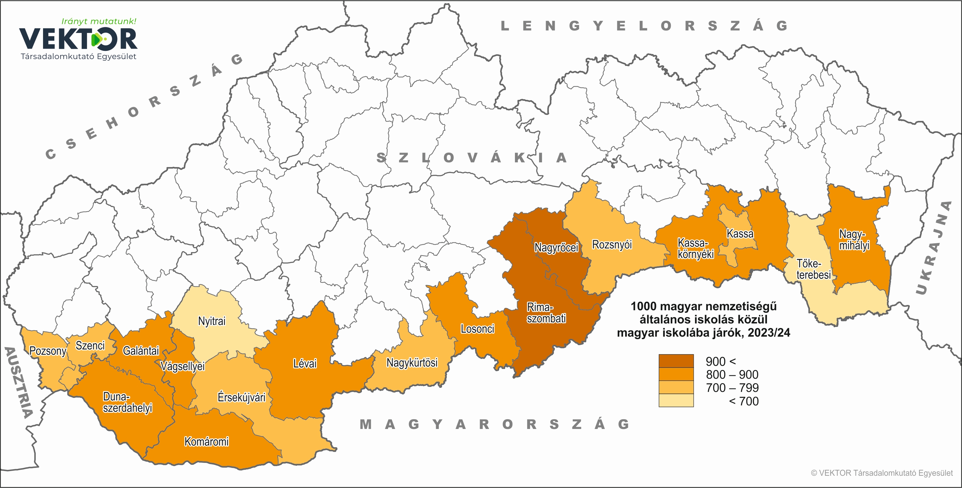 Az elmúlt másfél évtized kedvező folyamatok játszódtak le e téren: a 2010/11-es tanévben a magyar nemzetiségűek 83%-a járt magyar tannyelvű általános iskolába, 2023/24-ben 85,6%. A változás ott a legjelentősebb, ahol nagyon alacsony volt a bázisérték (Rozsnyói járás: 9, Pozsony és Szenci járás: 8–8 százalékpontos növekedés). Ahol azonban már eleve viszonylag magasak voltak az értékek, pl. a magyar többségű Dunaszerdahelyi és Komáromi járásokban, ott a növekedés mérsékelt maradt. A vizsgált időszakban mindössze két helyen csökkent a beiskolázási mutató: a Nyitrai járásban és Kassán (mindkét helyen 2,5 százalékponttal), ami leginkább a magyarok alacsony arányával, és a hétköznapokat meghatározó vegyes élethelyzetekkel hozhatók összefüggésbe, amelyekből jellemzően a szlovák iskolába vezet az út.