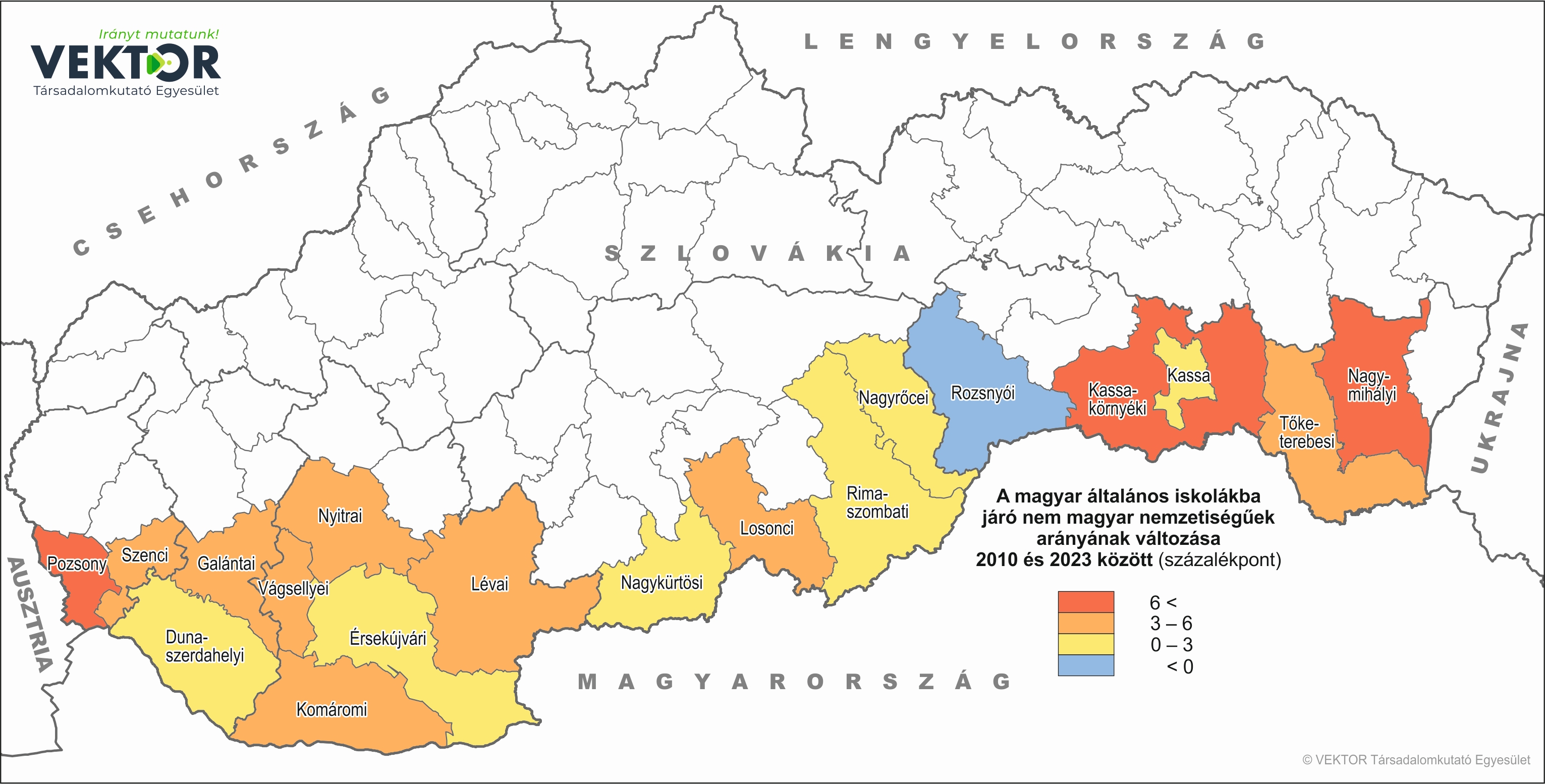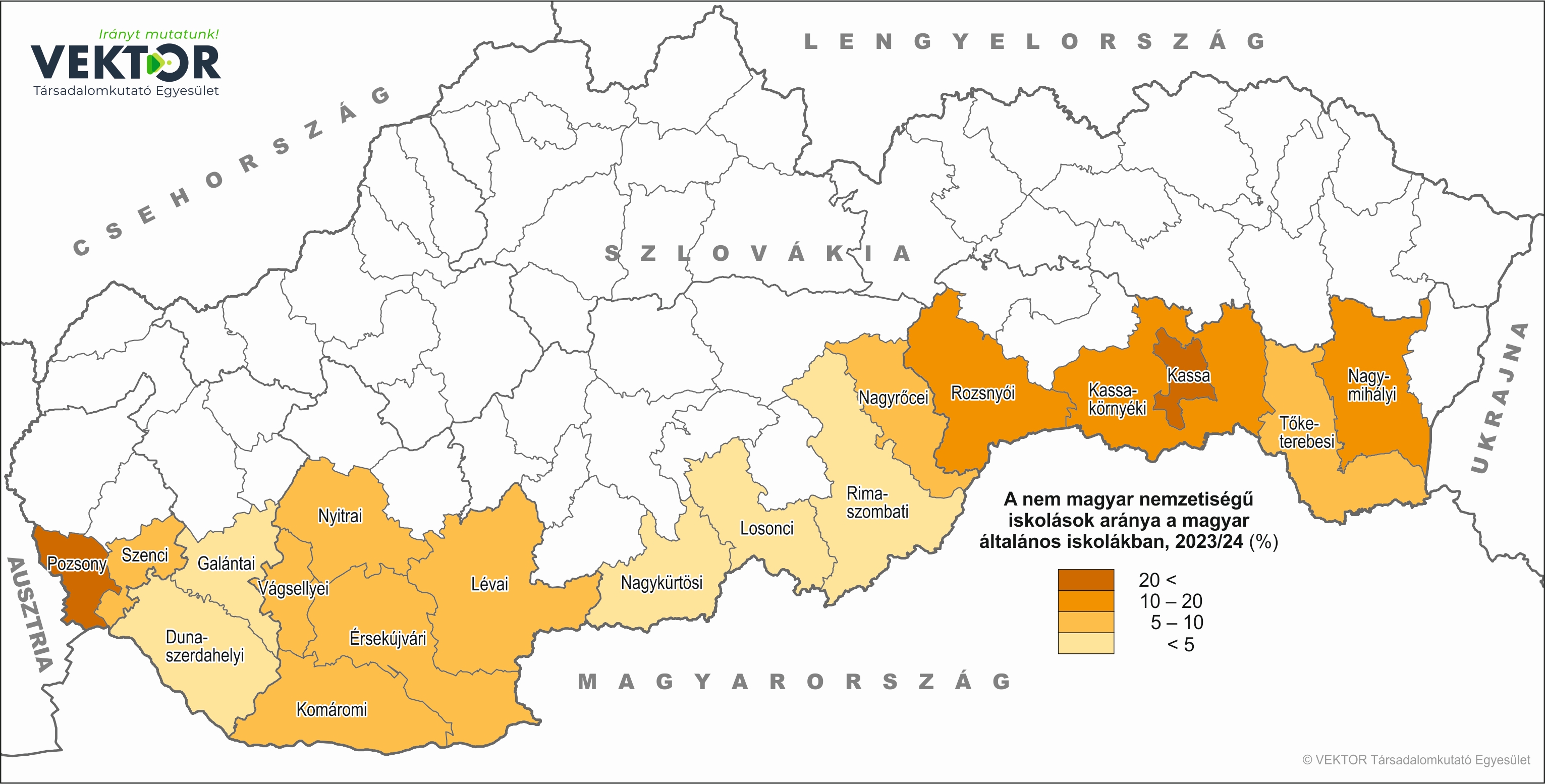 Abból, hogy míg a magyar iskolába járók száma enyhén, addig a magyar nemzetiségűeké nagyobb mértékben csökkent, részben az következik, hogy a magyar tannyelvű iskolákba jelentős számban járnak nem magyar nemzetiségű gyerekek. A 2023/24-es tanévben a magyar iskolába járó gyerek közül 6,3% – azaz 1830 fő – nem magyar nemzetiségű volt. E közel kétezer gyerek háromnegyede szlovák, ötöde roma volt. A nem magyarok aránya az iskolákban egyébként jóval alacsonyabb, mint a magyar óvodák esetében. Mindez arra világít rá, hogy míg a magyar óvodába bátran adnak be vegyes házasságból származó (de nem magyarként regisztrált) gyerekeket, addig az iskolaválasztásnál már „nagyobb a tét”, és az érvényesülés útjának sokan inkább a szlovák iskolát látják. A nem magyar gyerekek leginkább a nagyvárosokban jelennek meg magyar iskolákban, amiből már sejthető, hogy miért éppen ezeken a helyszíneken nőtt leginkább a magyar iskolába járók száma. Egyben azt is mutatja, hogy a nagyvárosokban kiemelkedően magas a vegyes családokban élők aránya. A nagyvárosokon kívül még ott magas a nem magyarok részesedése, ahol megjelennek a romaként regisztrált iskolások (Rozsnyói, Nagymihályi és Kassa-környéki járások), ami inkább csak a regisztráció sajátosságairól ad információt, mivel nem csak ezen járásokban élnek magyar romák. A skála másik végpontját a „legmagyarabb” járás, a Dunaszerdahelyi jelenti, ahol a nem magyarok aránya mindössze 2,7%.