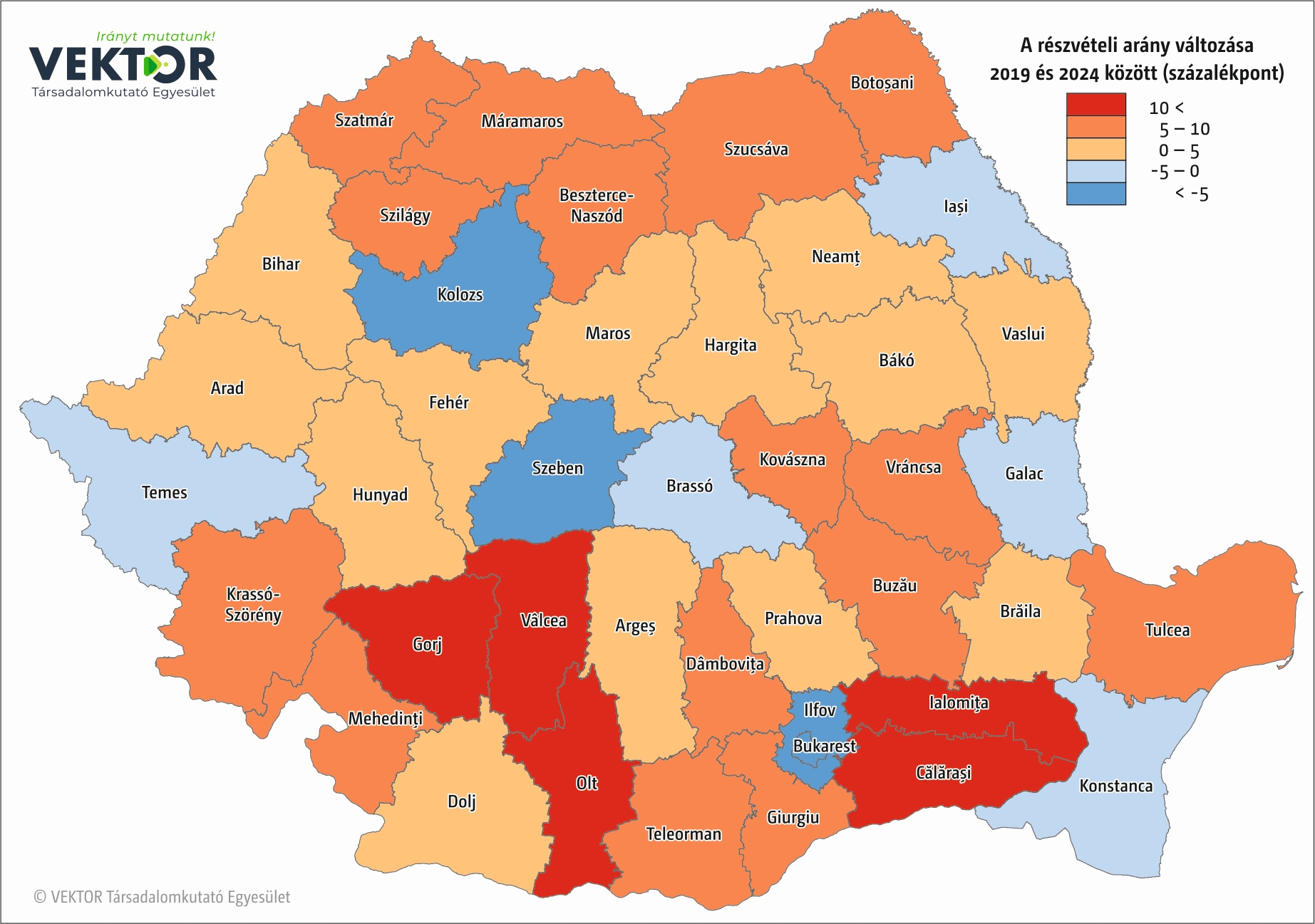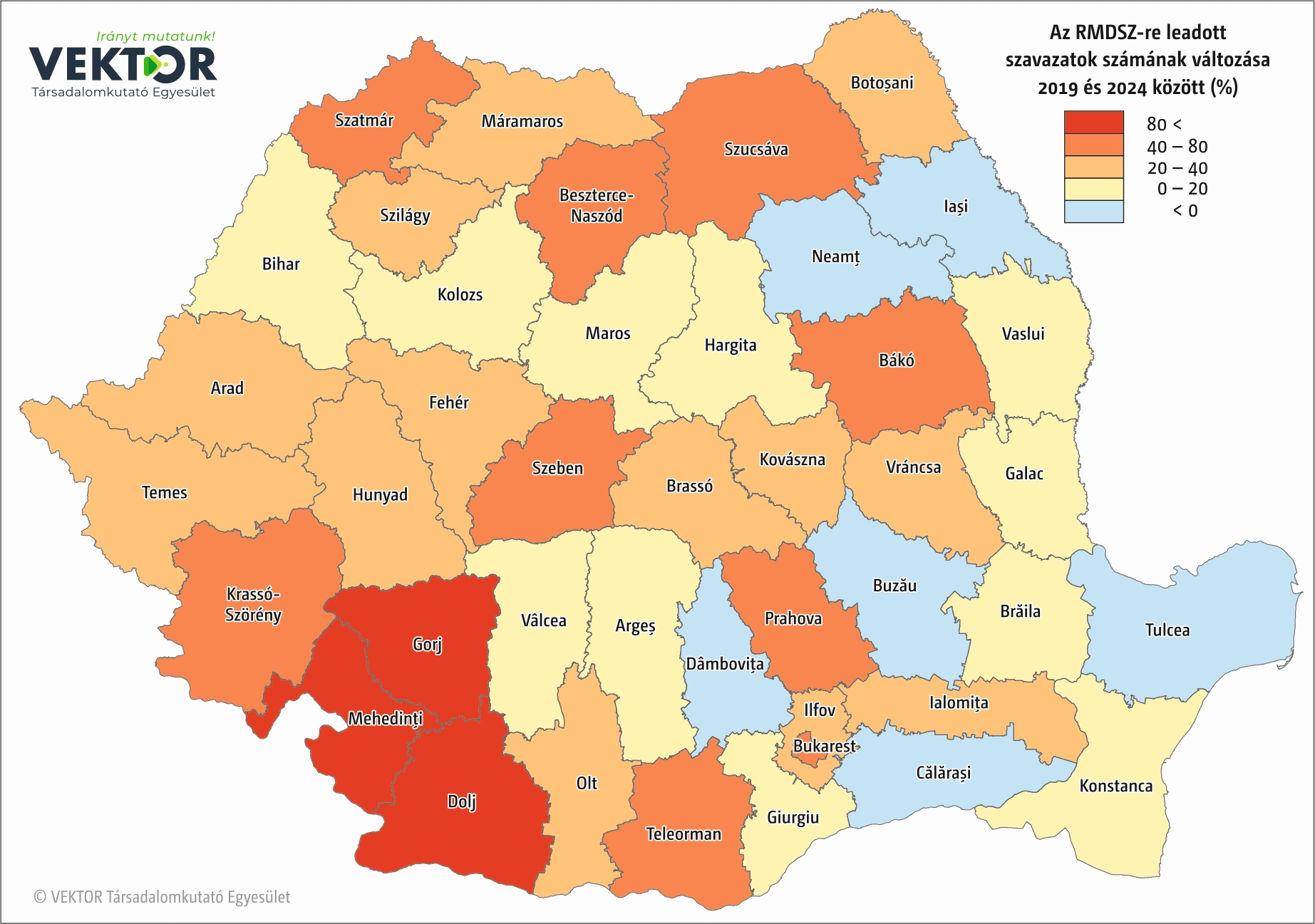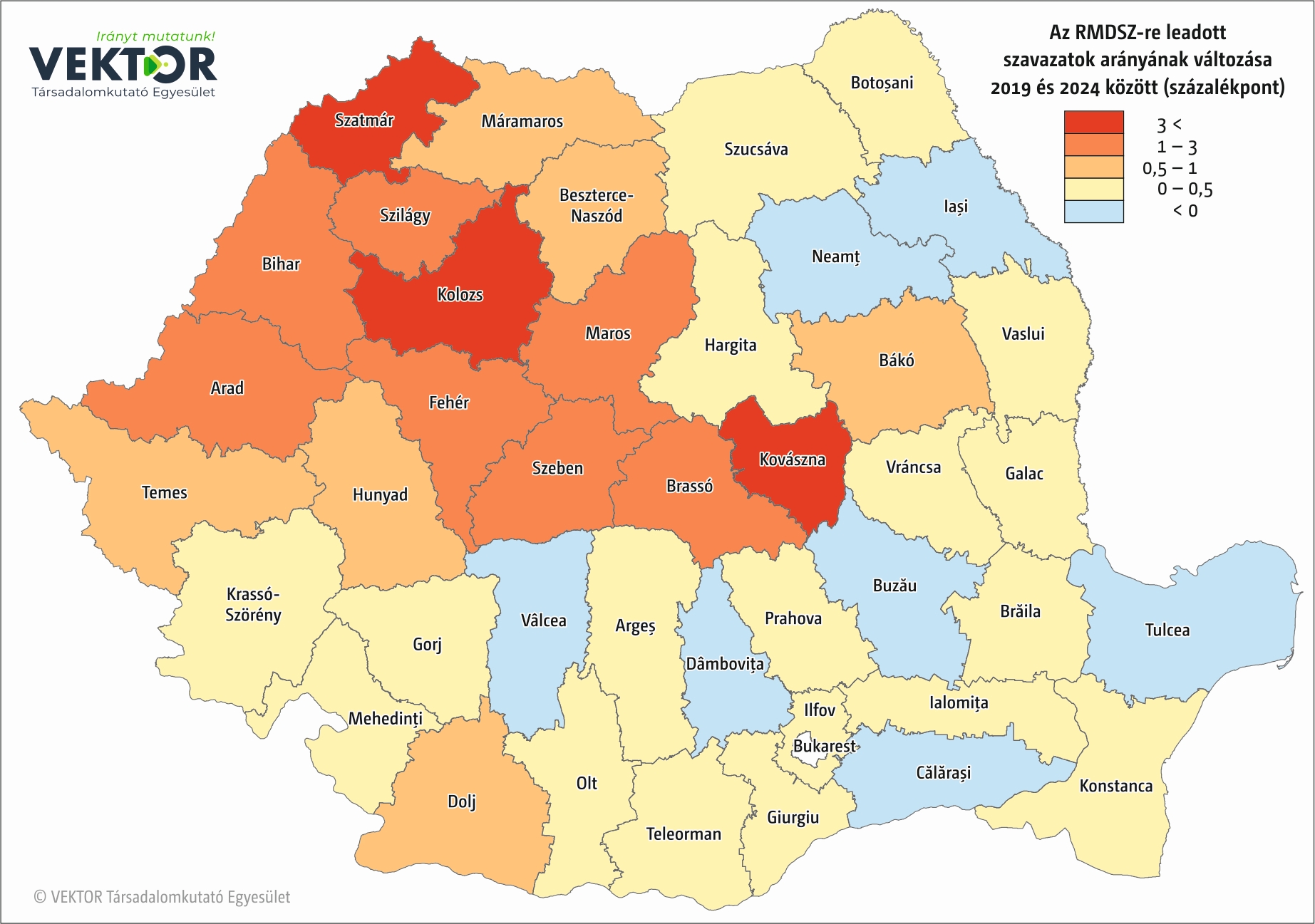 Az RMDSZ-re leadott szavazatok arányának változását mutató térképen látszik, hogy Szatmár és Kovászna mellett Kolozs megyében sikerült a leginkább javítani, ez abszolút számban 6 800 voksot jelent. Fontos, hogy csökkenés sehol nem figyelhető meg Erdélyben.